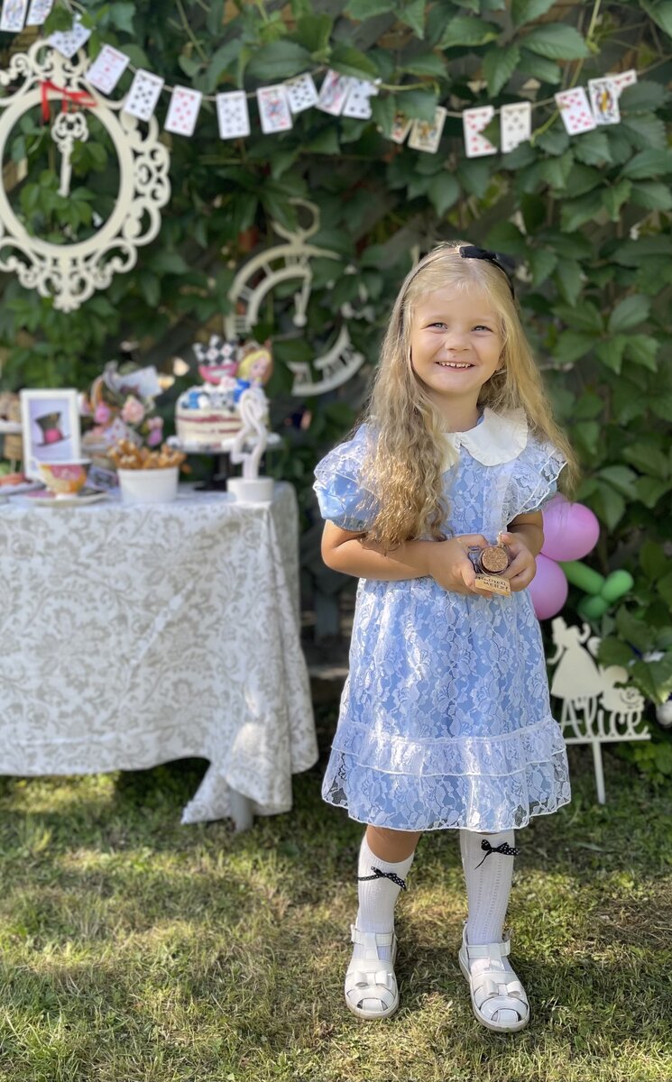 Перед днём рождения моей младшей дочери встал вопрос - в какой тематике оформить праздник? И как это сделать экономно? Ответ пришел сам собой. Под руку попался старенький школьный фартук из белого кружева. Дочь зовут Алиса. У нашей родственницы есть кролик… Итак, как оригинально и бюджетно оформить день рождения в стиле «Алиса в стране чудес» Л.Кэрролла. Костюм. Мы взяли простенькое голубое платье с белым воротничком, белый школьный фартук, белые сандалии. На белые гольфы пришила по черному бантику спереди. Такой же черный бантик приклеили на клей-пистолет на основу от старого ободка. Получилась вот такая милая именинница Алиса. Фотозона. Под фотозоной я опишу место, которое мы украсили для фотографирования и где у нас стоял сладкий стол для детей. Третий день рождения Алисы решили отмечать на даче, благо с погодой повезло. Но такое же оформление можно также использовать и в квартире. Старались использовать как можно больше вещей и предметов, уже имеющихся у нас дома или таких, чья с