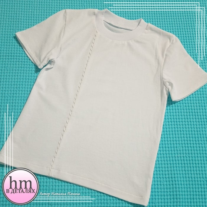 Миновало 2 недели учёбы и за этот период я успела сшить всего лишь 3 футболки в белом цвете для дочки на физкультуру. Сшить просто футболки было не вариант, т.к. нужны подсказки для определения переда. Поэтому я сделала самое просто что можно было придумать - защипы, кант из вьюнка и фигурный шов по центру. Для пошива брала 3 разные выкройки: