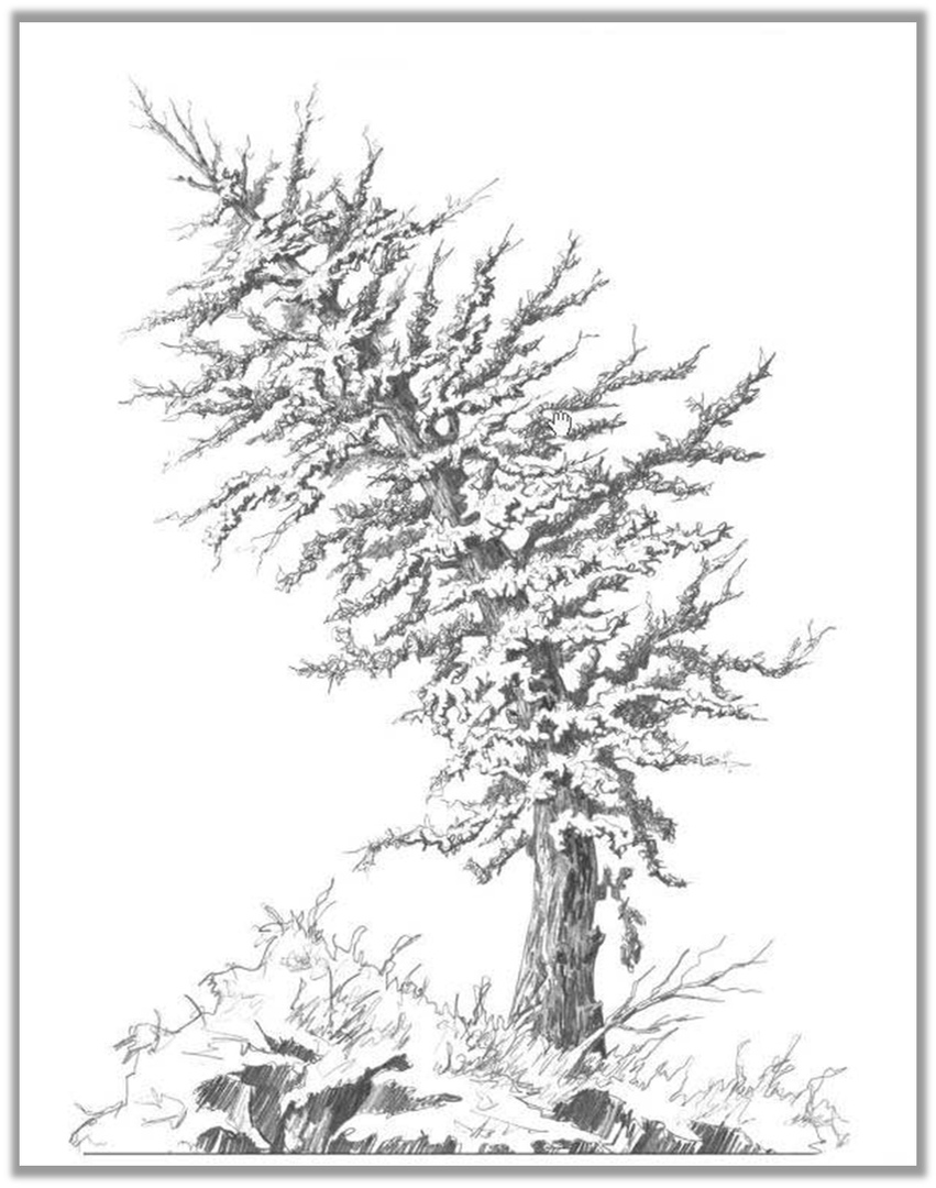 Перед тем, как начать урок вы должны знать технику рисования кудряшек (завитушек), сам урок находиться здесь. Предположим, что вы освоили технику, теперь перейдем непосредственно к уроку. Это выдуманное дерево, в этом уроке главное техника, а не само дерево. Можете взять дерево из фото и рисовать его. Ошибка начинающего при рисовании дерева — это рисовать только боковые ветви, забывая про ветви, которые растут спереди и сзади дерева. Шаг 1. Рисуем линии контра дерева и холма, теперь нарисуйте контуры ветвей, которые находятся позади. Жмем на картинку для увеличения. Шаг 2. Теперь рисуем ветки, которые расположены по бокам дерева. Шаг 3. Внизу рисунка прорисовываем траву, дополняем разными линиями. Шаг 4. Рисуем ветви, которые находятся спереди. При рисовании стирайте линии, которые находятся внутри нарисованных веток, тогда вы более точно определите правильно ли вы нарисовали секции у дерева, если вы случайно стерли нужные ветви, нарисуйте их опять. Шаг 5. Возьмите карандаш НВ и до