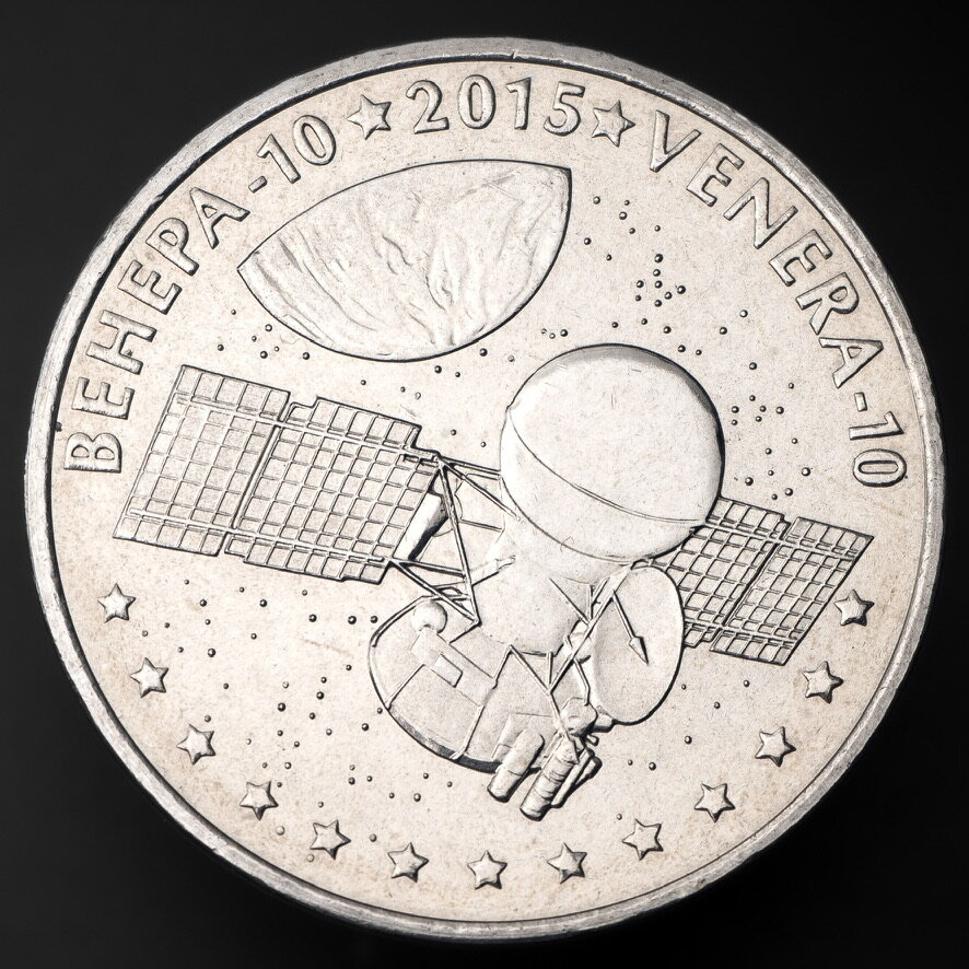 Советская космическая программа изучения планеты Венеры насчитывала 16 аппаратов. Запуски проводились с 1961 по 1985 годы. В 1975 году два спускаемых аппарата станций «Венера-9» и «Венера-10» совершили посадку на поверхность планеты. Кадры, переданные этими аппаратами стали первыми в мире фотографиями, переданными с поверхности другой планеты. Спускаемые аппараты смогли продержаться в агрессивной атмосфере планеты около часа и затем вышли из строя. Сами станции остались на орбите Венеры и стали ее первыми искусственными спутниками. Продолжением программы исследований стал проект «Вега» (два запуска в июне 1985 года). В пост-советской России пока все запуски к Венере только в проектах. Республика Казахстан 50 тенге «Космос — Венера-10» 2015 Цена: 119₽
