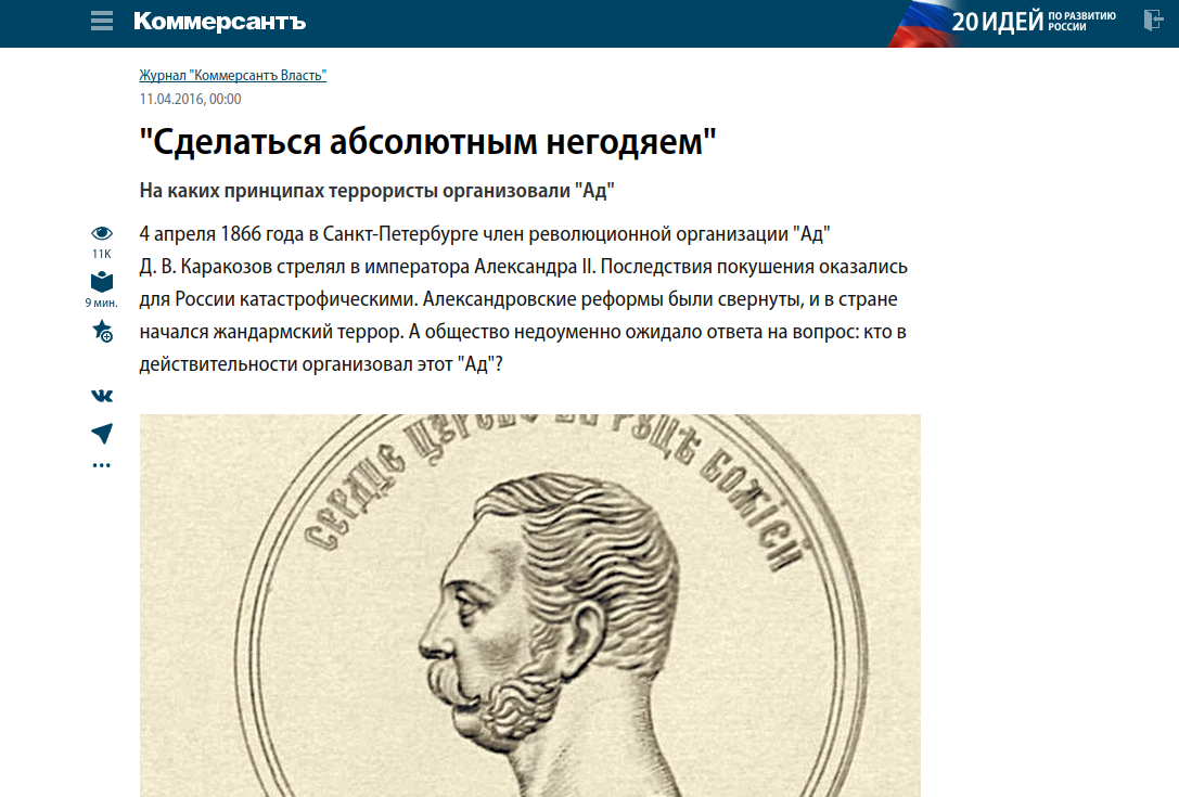 Увидел статью на сайте газеты «Коммерсантъ» (из журнала «Коммерсантъ Власть» 2016 года) о покушении Каракозова. Автор статьи Евгений Жирнов заканчивает пересказ сюжета покушения Каракозова следующим пассажем: – – – Однако, как утверждал Ишутин, он уже не мог влиять на двоюродного брата, поскольку тот встретился и познакомился с человеком из окружения великого князя Константина Николаевича – брата императора: «По приезде своем в Москву Каракозов сообщил мне, что... звал кого-либо из нас в Петербург, и тут же прибавил, что можно бы познакомиться с очень сильными людьми Константиновской партии и что они дадут большие деньги тому, кто решится на убийство государя; смертью государя воспользовался бы Константин и при помощи происшедшей паники от этого как в обществе, так и в наследнике вступил бы на престол, ибо наследник отказался бы от престола. И что он, Каракозов, хочет предложить услуги». Кем был тот человек и был ли он вообще? Страдавший нервным расстройством Каракозов в особенности по