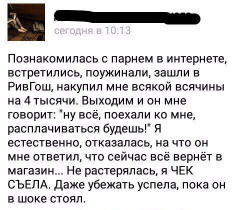 А если бы находчивая дева знала, что парфюмерно-косметические товары надлежащего качества не подлежат обмену и возврату, не пришлось бы есть чек!
