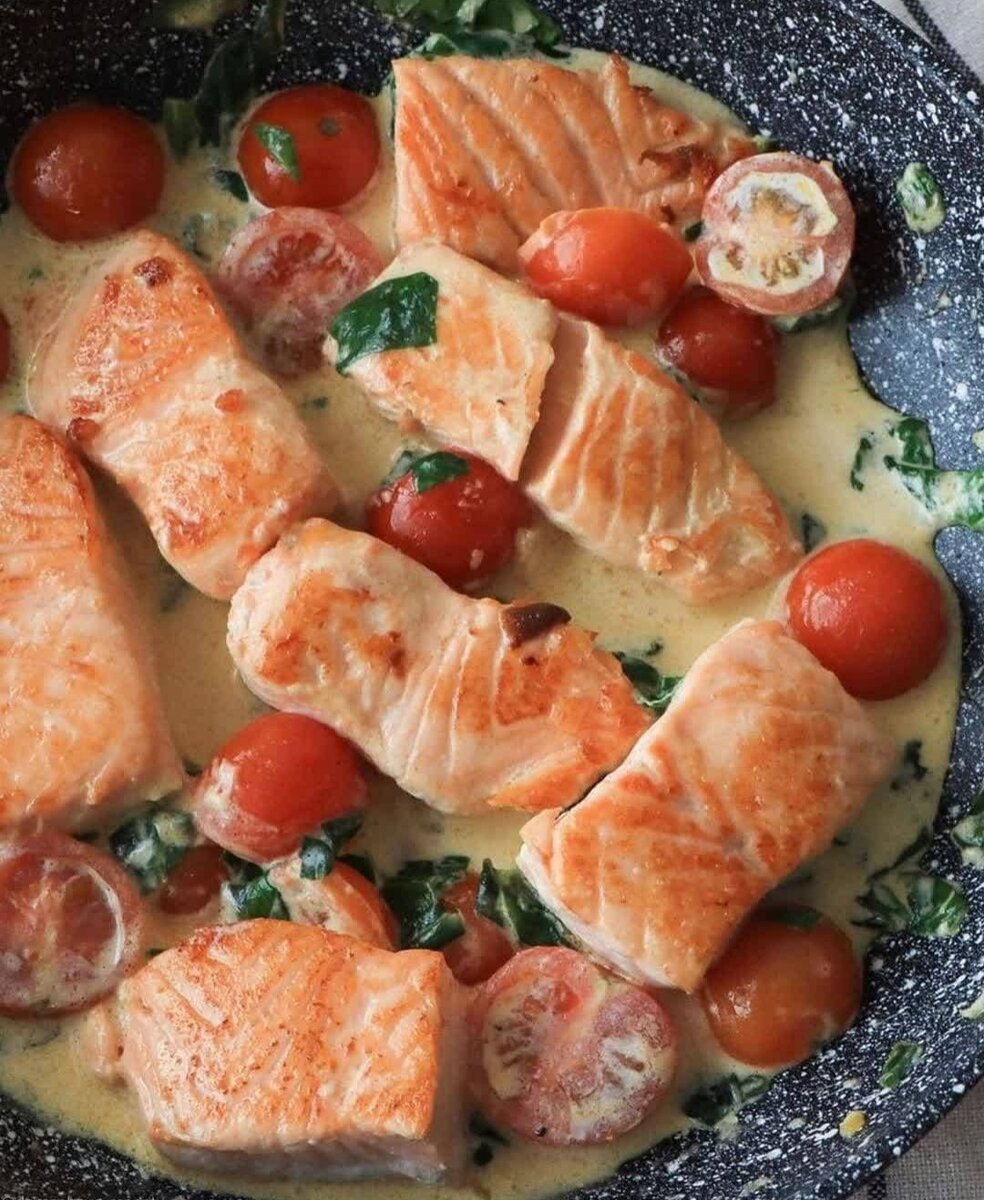 6) В сливочный соус положить обжаренный лосось, тушить 3 - 4 минуты .