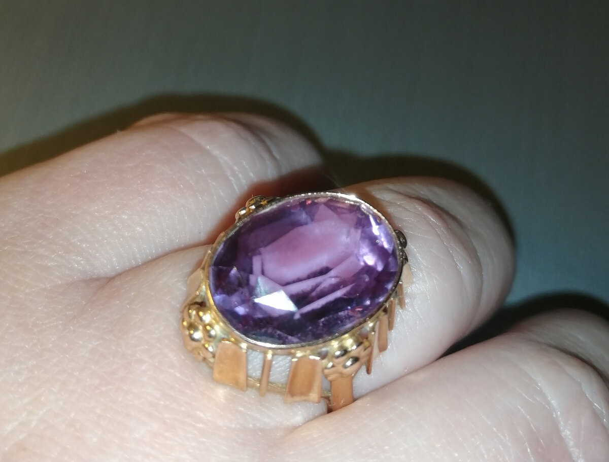 Этому кольцу лет больше чем мне и почему-то это очень приятно. Александрит - при дневном свете зеленый, при искусственном - фиолетовый. Считается, что в случаях, когда хозяину грозит опасность, может это предсказывать и меняет цвет на алый.
