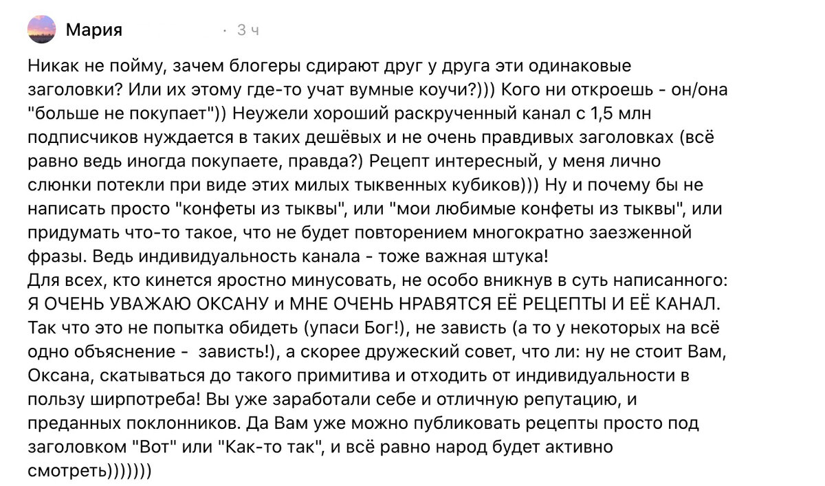Действительно, давно нужно было об этом поговорить... Я напишу здесь то, что обычно пишу в ответ на комментарии типа «Вы самодостаточны, не стоит копировать других и скатываться до примитива!». С одной стороны, мне очень приятно это читать, с другой - немного все же обидно... Мне часто советуют "не терять индивидуальность", "называть статьи не так, как все". Но я и называю не так, как все... В каждом коротком заголовке я всегда стараюсь рассказать целую историю блюда и не чужими словами, а именно передать свои эмоции! Так всегда было на моем канале и это именно то, что вам всегда нравилось. К сожалению, сейчас все сложнее "сохранять индивидуальность", выкладывая что-то в интернет. Тут же все бездумно копируется(( Тут же... С каждым днем получаю все больше комментариев, подобных вот этому (Мария, спасибо за Ваш комментарий!): Комментарий вот к этому ролику: Я обычно отвечаю каждому и «оправдываюсь». По-другому это не выглядит. Именно "оправдываюсь". Но я реально устала от подобных под