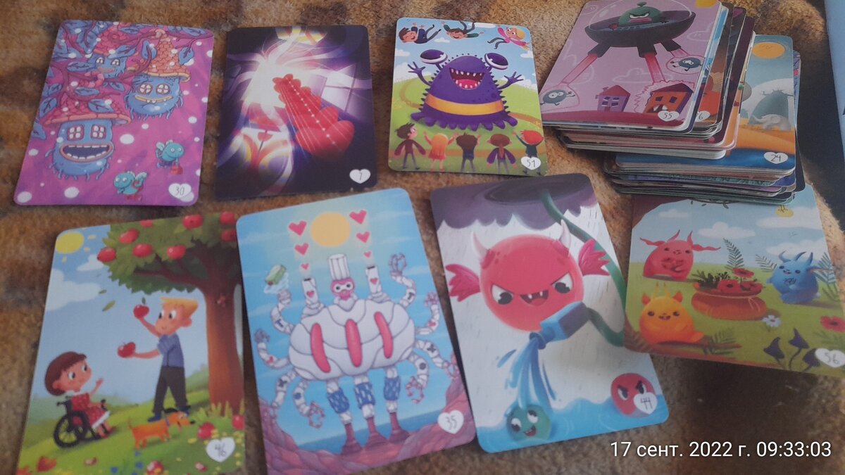 С утра вывихнули, взорвали, заплющили и что там еще бывает? свои мозги. Наглухо. А потому что бабушка внученьке на день рождения коробочку с игрой подарила... Оооооооооо....Может мы такие тупые и отсталые. Может мы совсем не умеем играть с детьми... В общем, решили коробку вернуть бабушке. Пусть там играют. Они умнее, они умеют.... Реально мозг встал колом. Кто помнит книгу про волшебника изумрудного города? Там герой Страшила. За мозгами он к Гудвину ходит. Тот ему в соломенную голову напихал булавок и иголок. И вот когда Страшила напрягался в думах иголки вылазили наружу. Вот и у меня сейчас такое же ощущение. Что торчат во все стороны у меня из головы иголки и булавки. А само серое вещество вытекает из ушей... А все банально и просто. Надо взять карту из колоды, придумать на нее ассоциацию и пусть другие игроки угадывают по вашей ассоциации, что изображено на карте. Угадают, значит продвигаются вперед. Не угадают, остаются на месте, продвигается вперед загадывальщик... Ну, кто см