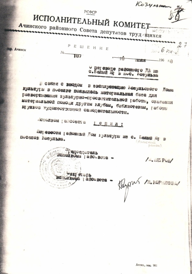 Р С Ф С Р И С П О Л Н И Т Е Л Ь Н Ы Й К О М И Т Е Т Ачинского районного Совета депутатов трудящихся гор. Ачинск, ул Ленина, № 21 Р Е Ш Е Н И Е г. Ачинск № 191 26 мая 1966г. О переводе Козульского Дома культуры В группу районных Домов культуры. В пос. Козулька Ачинского района строится по проекту кирпичное 2-х этажное здание Дома культуры на 400 мест, которое будет сдано в эксплуатацию в конце 1966 г. Пос. Козулька бывший районный центр присоединен к Ачинскому району, эта группа сел удалена от райцентра более 70 км., а отдельные населенные пункты до 130-150 км. В этой группе имеется 14 бюджетных клубов, более 20 профсоюзных клубов и красных уголков, а также клубы ЛПХ и ж/д. Население пос. Козулька 7647 чел., а всей зоны более 33 тыс. человек. С целью создания методического центра культпросвет учреждений исполком райсовета Р Е Ш И Л: 1. Просить управление культуры т. СИДОРОВУ М.А. перевести Козульский Дом культуры с 1.01 -67 г. в группу районных Домов культуры и установить следующий штат: директора, 2-х методистов, инструктора, 4 чел. Кочегаров. ПРЕДСЕДАТЕЛЬ ИСПОЛКОМА РАЙСОВЕТА ( М.ПЕТРОВ) СЕКРЕТАРЬ ИСПОЛКОМА РАЙСОВЕТА ( Н. КОРНИЕНКО)