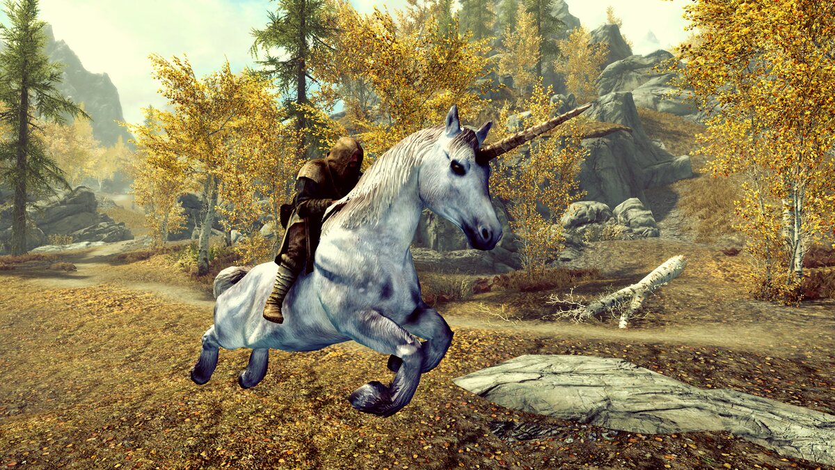 Ездовые животные Довакина. …В библиотеке Коллегии магов Винтерхолда Довакин заметил лежащий на столе дневник Сорана. Ворчливый Ураг ничего не сказал, когда он потянулся к книжице в кожаной обложке; и герой, осмелев, взял её в руки и принялся читать: Единорог… Об этих существах из мифов понаслышке было известно лишь то, что они очень легко и безбоязненно идут на контакт только с прекрасной половиной человечества. Красивая, а самое главное – непорочная молодая дева, желательно обнажённая, едва появившись в лесу и запев, моментально привлекает великолепного зверя. Прискакав на нежный зов, покорённый чистотой её души и тела единорог опускается рядом на травку и доверчиво закрыв глаза, кладёт свою голову деве на колени… …Довакин критически осмотрел себя. Небритый грязный мужик в прожжённой заклинаниями и покрытой пылью Саартала магической робе на деву, тем более, непорочную, был совсем не похож. Да и с голосом дела обстояли неважно – если он запоёт, скорей все разбегутся-разлетятся куда п
