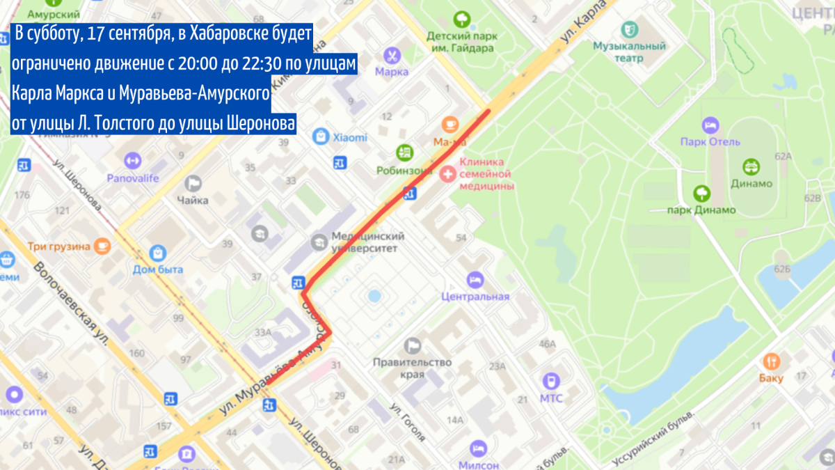 В Хабаровске уже стартовал масштабный фестиваль «Арсеньев LIVE». В рамках этого состоит не только праздничная программа, но остановка транспортного движения по улицам Карла Маркса и Муравьева-Амурского от улицы Льва Толстого до улицы Шеронова. Перекрытие дорог продлится с 20:00 до 22:30. В связи с этим скорректировано движение общественного транспорта - их маршруты сократят с 20:00 до 22:30, а затем продлят время работы автобусов и троллейбусов до 23:30. Троллейбус № 1 будет следовать по маршруту «Аэропорт – Улица Московская». Автобусы на маршрутах № 14, 19, 34, 56, 61К, 82 в направлении центра города будут двигаться с улицы Карла Маркса по улицам Л. Толстого, Амурский бульвар, Дзержинского, Муравьева-Амурского и далее по установленным маршрутам. На маршрутах № 21, 58 в направлении центра города транспорт будет следовать с улицы Карла Маркса по улицам Л. Толстого, Амурский бульвар, Шеронова, Амурский бульвар, Л. Толстого на улицу Карла Маркса и в обратном направлении по установленным м