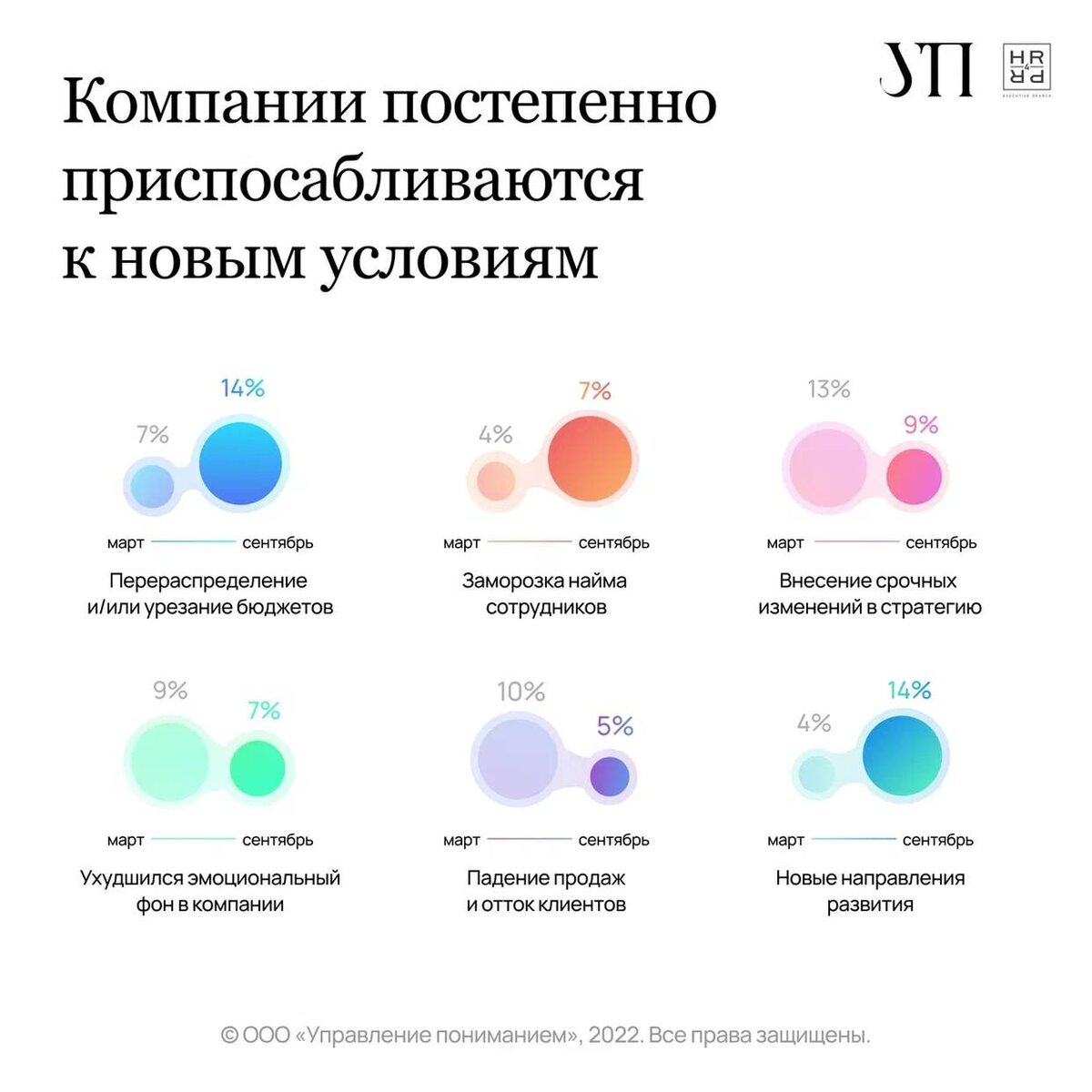 Коммуникационное агентство «Управление пониманием» совместно с HR4PR Executive Search выяснили, что и как поменялось в подходе российских пиарщиков по выстраиванию внешних коммуникаций начиная с февраля 2022 года. Для этого они опросили руководителей и сотрудников PR-департаментов в 64 российских компаниях и организациях, которые представляют 20 ключевых отраслей: B2B-услуги, IT, розничная торговля, образование и другие. 👇🏻 Основные результаты исследования: — у большинства получилось адаптироваться к новым сложным условиям: если в марте в фокусе специалистов было решение текущих задач, то сегодня на 14% выросла доля компаний, которые начали развивать новые направления деятельности; — при этом рост значимости PR в целом в 2022 году отмечают 17% опрошенных компаний; — кризисные ситуации пиарщики теперь решают более уверенно: внесение срочных изменений в PR-стратегию актуально сегодня только для 9% компаний и до 7% уменьшилось количество организаций, где фиксируется ухудшение эмоционал