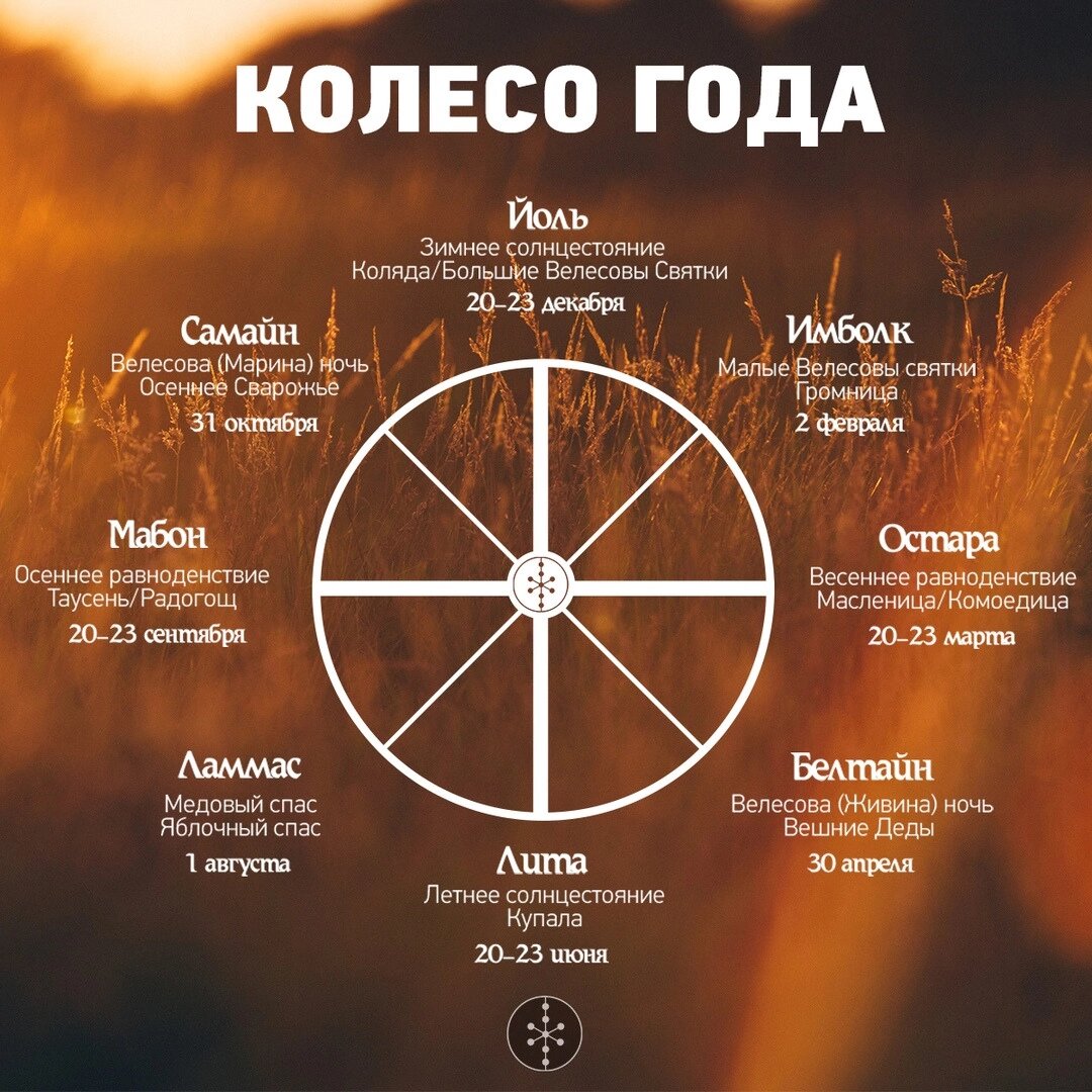 Наша жизнь не только про колесо Сансары, но ещё про Колесо года))) Есть в году 8 точек входа, 8 праздников, 8 сонастроек с пространством. Сегодня про одну из них, ближайшую – Самайн. С 31 октября на 1 ноября. Этот день не совсем про Хэллоуин 🎃, его называют Велесова ночь, ночь Марены, Духов день. Раньше следование колесу года было связано с выживанием, если вовремя не делать определенные вещи, то зимой можно остаться голодным. Всему своё время. Есть время весны 🌱, когда хочется мечтать, вынашивать планы и в кого-нибудь влюбиться. Летом 💐 хочется ЖИТЬ на полную, встречаться с друзьями, вставать рано, ложиться поздно. Осень 🍁– время, чтобы уютиться дома, не хочется лишний раз ходить на улицу, аккумулируешь тепло, собранное за лето. И вот зима ❄ – хочется спать подольше, мы весь год сажали, пахали, собирали урожай и теперь время отдыха. Мы часть природы и такие же ритмичные! Рассинхрон конечно может быть, а могут быть и свои личные циклы, когда за год несколько пиков и спадов. Но ка
