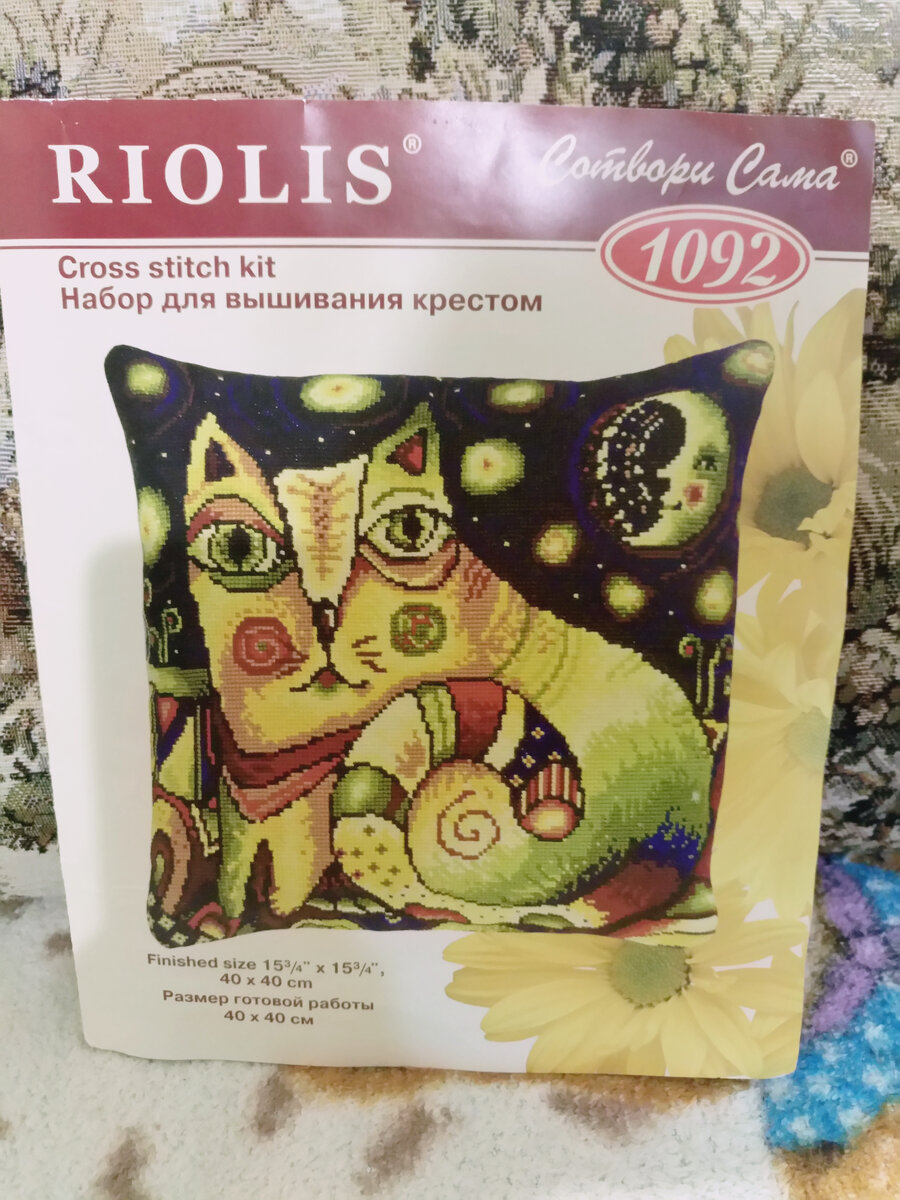 Здравствуйте, дорогие мои! Хочу поделиться с Вами радостью. Наконец - то я добралась до одного очень красивого наборчика от "Риолис" - " Лунная дорога". Давно он у меня в запасах. Я не очень признаю абстрактные и ассиметричные сюжеты в вышивке, но иногда могу сделать исключение. В данном случае меня влюбила палитра ниточек. Пускай будет этот необычный кот, но какой кот! Какими цветами будет выкрашен небосвод и какими засияют звёзды - это просто волшебство! Люблю я всякое волшебство! А может это кот баюн?!)) Схемка, как обычно, цветная символьная.Канва 10 - одно удовольствие на ней вышивать! Вот, просмотрите, что получается Работа только начата, но летит быстро! Следите за отшивом, не пропускайте. Желаю Всем здоровья, хорошего настроения и успехов в Ваших начинаниях! До новых встреч!