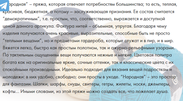 В пряже с синтетикой предел для названия "полушерсть" - это 30% шерсти, остальное акрил и т.п. И немалому числу человеков надо максимально недорогую пряжу с шерстью, которая все же визуально выглядит достойно. Одна из них - как раз наша отечественная "Народная" от Пехорки. И вот она "Народная" навстречу нам пошла И много-много радости вязайнерам принесла :)) Что о ней пишет производитель: Цветовая палитра не скудная, цвета хорошие. В ней 30% шерсти и 70% высокообъемный акрил. 220метров, 100грамм. Для спиц 4мм. Есть более тонкая, "Народная классика", я не стала брать. Но в подмот когда-нибудь - почему бы и не: В ней на 100гр - 400 метров, для спиц 3,5мм. Их продолжение - это заметно более толстая "Народная традиция". Она как-то солиднее показалась. Более плотная скрутка, упругая... Пушистее. Потому и возникла ассоциация с известным чеховским рассказом. Состав тот же, цвета яркие, но толще: 100гр\100 метров. Отсюда, для спиц 7-8мм. Кстати, про цвета. На оф.сайте фабрики их почему-т