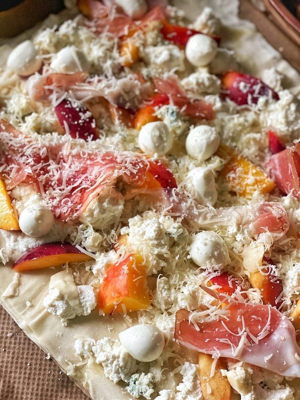 Я хочу, чтобы вы попробовали сочетание горячего нектарина и сыра. Это очень вкусно! Берём тесто фило, находим серединку и выкладываем на противень ровным пластом. Сверху сбрызгиваем оливковым маслом. Выкладываем рикотту по всему тесту. И далее всю начинку (сыры, нектарины, бекон). Все раскладываем м