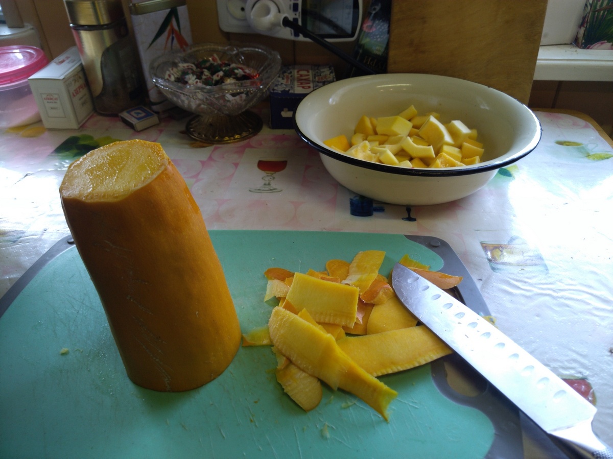 Ну чтож, начнём не молясь. Перво наперво, надо почистить кабачки. Собирал их под занавес, то есть последние, и кожура у них толстая и очень крепкая. Но у нас руки не для скуки, поэтому справимся. Чистим, и нарезаем кусочками. Не сильно крупными, но и не мельчим. Заготавливаем всё остальное. В частности, морковь, лук, и яблоки. В этот раз я буду добаввлять и томатную пасту. Во первых для цвета, ну и вкус будет пооригинальней. Можно сразу и чесночок порубить. Вы наверно уже заметили что я ни когда не пользуюсь чеснокодавкой