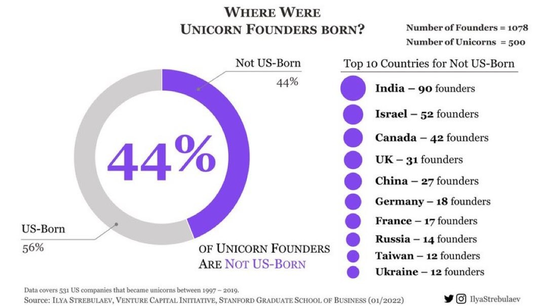 "Единороги" — это частные фирмы, оцениваемые в $1 млрд и выше (чаще всего это стартапы). Всего 1078 основателей, из которых 56 % родились в США (а в США, как вы понимаете, понамешано национальностей), а из 44 % рожденных основателей "единорогов" не в США 90 родились в Индии или практически каждый пятый из рожденных не в США.
