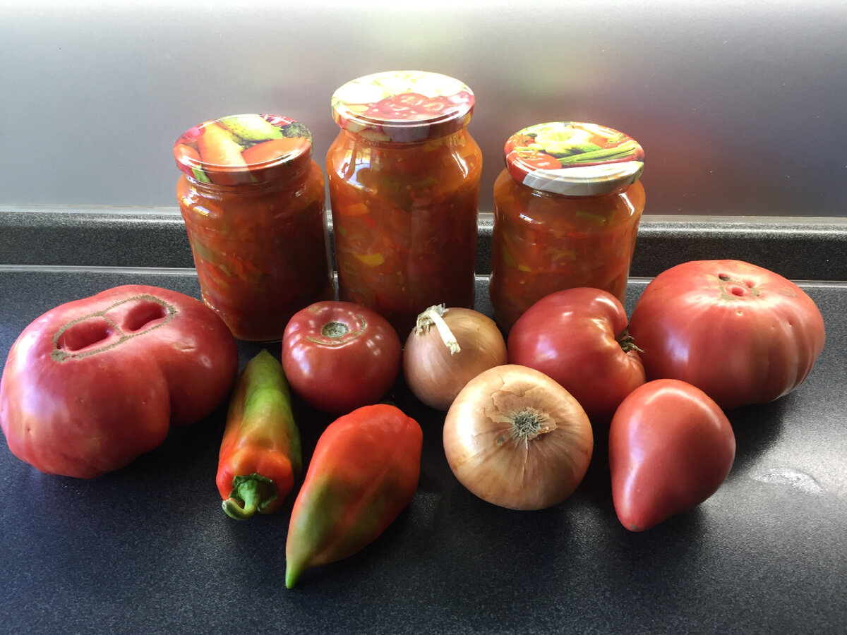 Сегодня хочу поделиться самым простым и быстрым рецептом лечо. У кого то ещё в теплицах дозревают последние томаты, перцы и казалось уже всего заготовили, но не пропадать же последнему урожаю, тогда готовим лечо. Заранее стерилизуем банки и крышки. Нам понадобиться 2 кг. помидоров, 1,5 кг. перца, 1 кг. лука, 300г . сахара, 2 ст. л. соли, 50 гр. уксуса. Помидоры перекрутить в мясорубке, перец порезать небольшими кусочками, лук разрезать на четыре части и тонко порезать. Все сложить в кастрюлю, добавить сахар, соль, уксус , тушить 25 минут. Горячее лечо разлить по банкам, закатать и укрыть. Хранить можно в прохладном месте. Каждый год закрываем все больше и больше, но все равно не хватает даже до нового года. Вот уже через день одна баночка успешно опустела. Завтра надо чем то заполнить , есть ещё помидоры, сладкие и острые перцы. Поищу другие рецепты , приготовлю и поделюсь с вами.