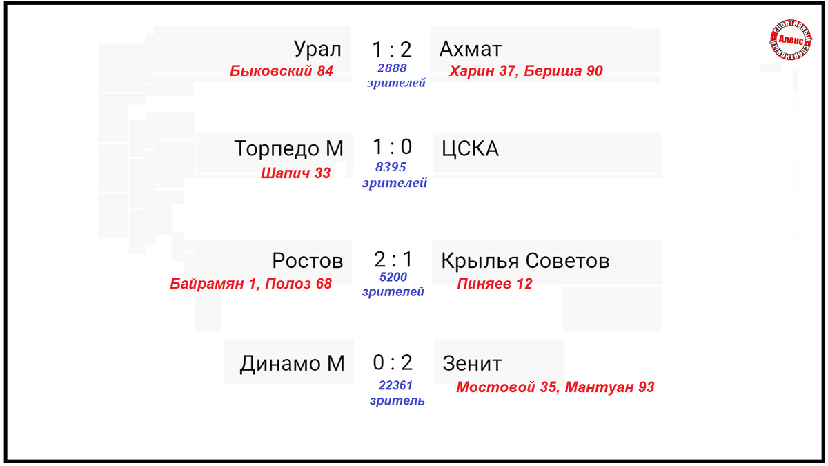В чемпионате России начался 10-й тур. Рассказываю о результатах субботних матчах, посмотрим расписание, посещаемость и текущую таблицу. Урал уступил Ахмату 1:2. Хозяева поля проиграли второй матч подряд. Ранее екатеринбуржцы уступили в кубке ЦСКА. На 90-й минуте Бериша принес победу гостям и открыл счет своим голам в сезоне. Стоит отметить, что Ахмат не проигрывает 6 очных встреч. Игру посетило 2888 зрителей. Торпедо победило ЦСКА 1:0! Армейцы получили первое поражение за 7 игр. Серб Шапич забил впервые. Напомню, Торпедо добыло первую победу в сезоне, одолев в Кубке России Сочи. Итого у команды 2 победы в 13 матчах. Игру посетило 8395 зрителей. Ростов победил Крылья Советов 2:1. В этом году, в апреле, ростовчане взяли верх с минимальным счетом. В составе победителей на 1-й минуте забил Байрамян. Полоз отличился во второй игре кряду. Хозяева поля не уступают 12 матчей (ни единого поражения в новом сезоне). Игру посетило 5200 зрителей. Динамо уступило Зениту 0:2. Игру обслуживал Сергей К