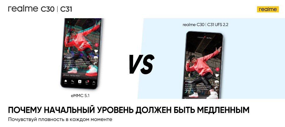 Привет, реалфаны! Продолжаем тему производительности и сегодня поговорим о еще одном важном параметре наших новинок realme C30 и realme C31, который обеспечивает им отличную производительность. Память, да да, не только процессор – CPU и видеокарта – GPU, влияют на производительность, но и память устройства способно значительно улучшить комфорт использования смартфона. Смартфоны realme C30 и C31 получили редкую для своего класса память UFS 2.2 которая еще каких-то пару лет назад была, уделом флагманов год назад стала активно внедряться в средней сегмент. Но в доступных и недорогих смартфонах как правило компании применяют более простой и медленный а главное недорогой тип памяти EMMC 5.1. И вот компания realme опять – меняет стандарты, делает прорыв, а технологии доступными для широкого спектра пользователей! Вы спросите: «так ли сильно может повлиять память на производительность?» ответ – да очень сильно! Давайте посмотрим на тесты: Более чем двухкратный прирост, явное преимущест