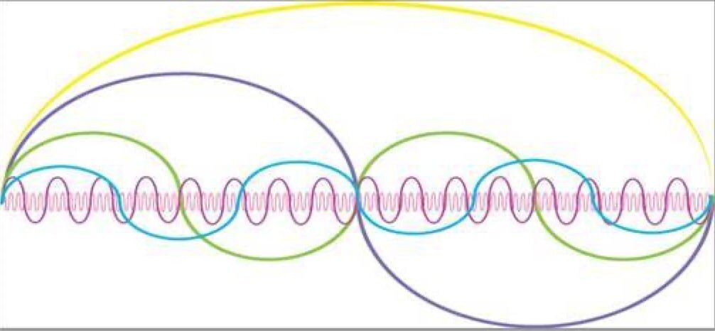 Это то, что Пифагор называл гармоническим рядом, используя монохорд для описания явления одновременных колебаний только одной струны. Когда струна вибрирует, и в то время как она колеблется по всей своей длине на основной частоте, все её частичные секции одновременно вибрируют на разных частотах, в зависимости от длины этих секций. То есть струна одновременно колеблется в своих половинах, третях, четвёртых, пятых секций и так далее, на разных частотах.
