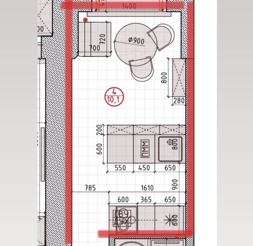 📎Линейная кухня👉🏼- большая рабочая поверхность, да, но разместить стол так, чтобы было комфортно и красиво не удастся, про диван даже говорить нечего..