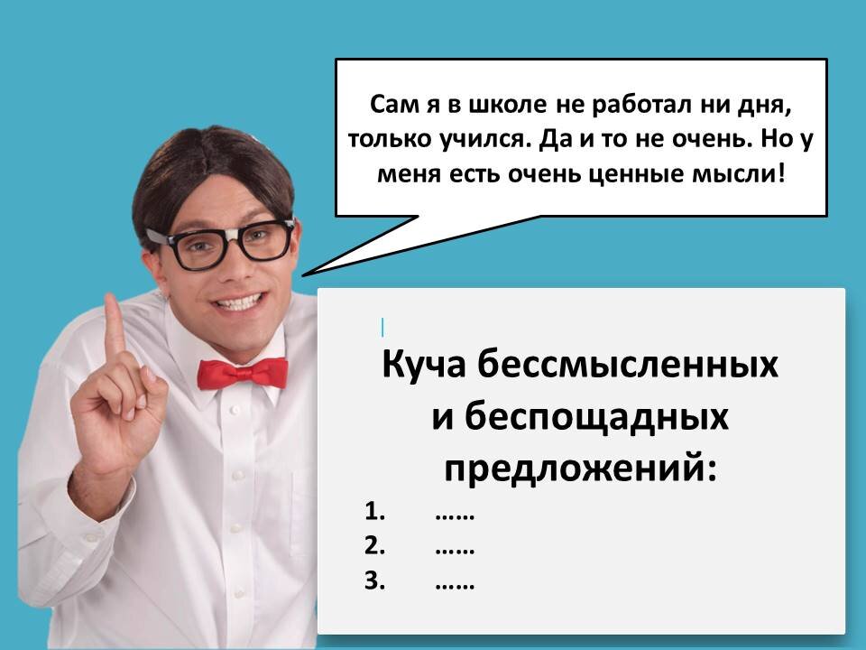 Но находятся милые люди, видящие источник всех зол исключительно в школе. Как правило, сами они в образовании не работают. Или работают, но в частных школах, или вовсе онлайн. Или они просто когда-то учились и всё, что помнят, это: «злыдня-учительница в девятом классе поставила два за сочинение, не оценив мои сверхмудрые мысли и ценное мнение». Не кажется ли вам, что как-то маловато для того, чтобы строчить огромные количества "экспертных" статей в этой области?