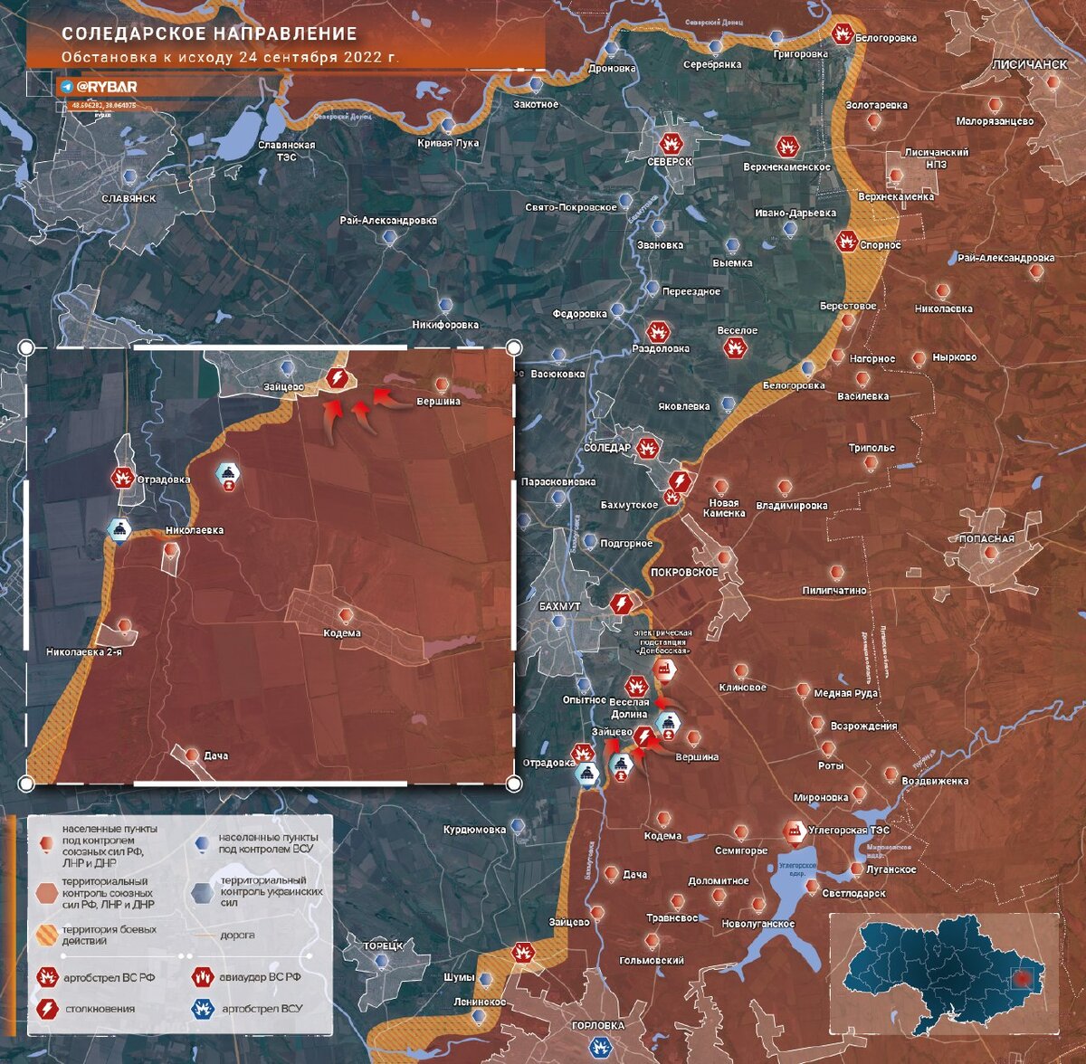 ▪️Отряды «ЧВК Вагнера» уничтожили крупные опорные пункты ВСУ к востоку от Отрадовки и к западу от Вершины. ▪️Передовые группы «вагнеровцев» вошли и закрепились на юго-восточной окраине Зайцево к югу от Бахмута (Артемовска). Бои идут в частном секторе. ▪️После освобождения ПС «Донбасская» бойцы «ЧВК Вагнера» продолжили наступление на запад в направлении Зайцево и Веселой Долины. ▪️Силы «вагнеровцев» на востоке Бахмута расширили зону контроля, продвинувшись вглубь садоводческого товарищества к северу от улицы Патриса Лумумбы.