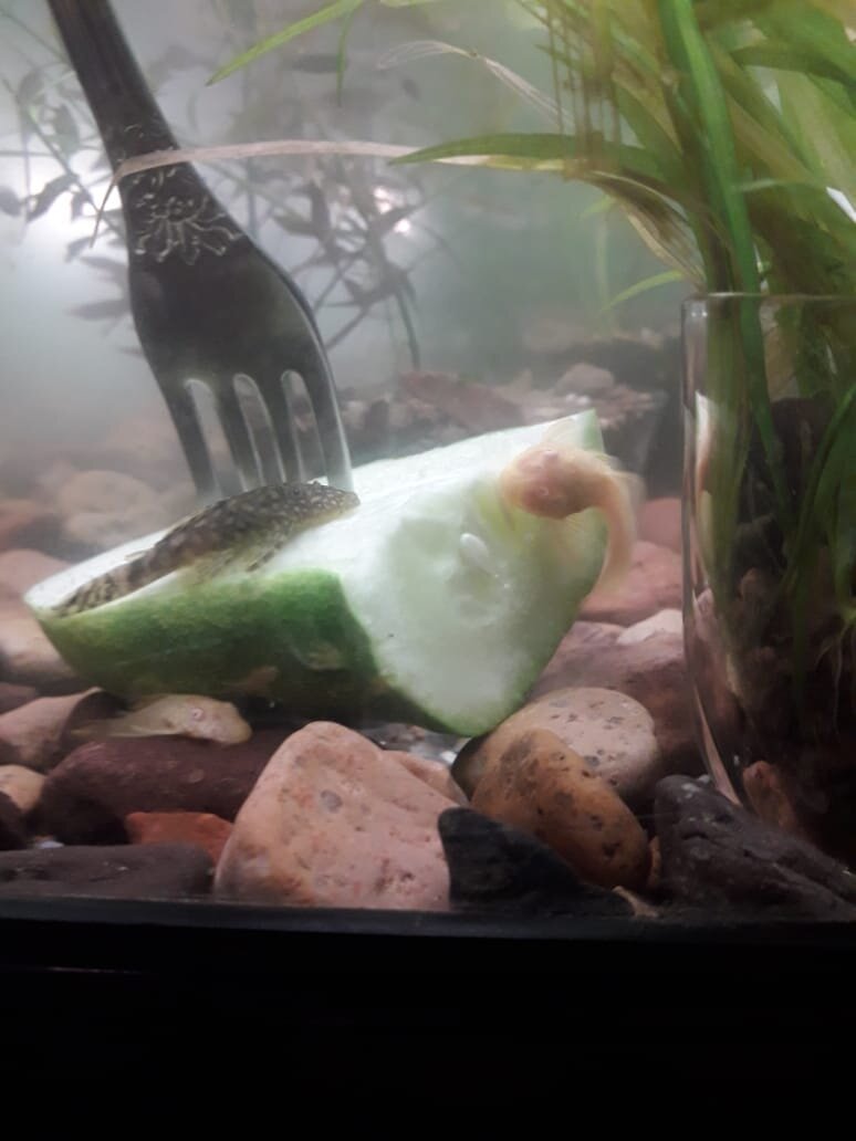 Вот так неожиданно для себя мы узнаём что- то интересное и новое. Сегодня я расскажу про наш опыт подкормки аквариумных рыбок свежим огурцом. Недавно нам подарили сомиков анциструсовых. Нам была необходима такая рыбка, которая избавит наши аквариумы от естественного загрязнения. И мы не ошиблись - в течение суток увидели результат, чему очень порадовались. Позвонили знакомой, поблагодарить за сомиков и узнали, что её питомцы любят полакомиться огурцом. Мы занимаемся аквариумными рыбками, но огурцы как корм никогда не рассматривали. Решили воспользоваться советом. Средний ломтик огурца на вилке опустили в аквариум. Естественно, что с утяжелителем огурец не всплывает и рыбкам невозможно перемещать его по периметру. Поэтому сомики один за другим начали подплывать и присасываться к мякоти огурца. Они периодически отплывали и снова возвращались. Стало понятно, что такая витаминизированная подкормка им пойдёт на пользу. Но в первый раз мы немного переборщили, оставив это лакомство на