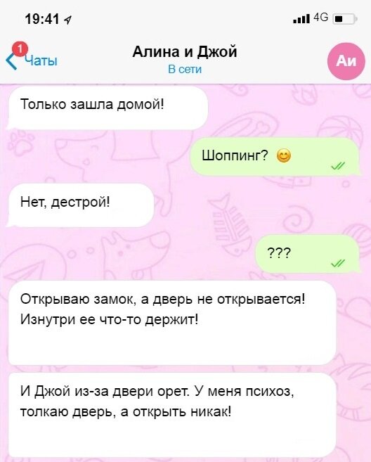 Не секрет, что хоть раз в год, но наши дома страдают от наших питомцев. То коврик у двери не понравился, то занавески пора менять... Бывают разрушения и позамысловатей. Наш хаски, например, лизал шов у обоев и, когда обои начинали отставать от стены - комната приобретала новый вид... Сегодня для Вас смешные переписки именно о том, как кошки и собаки разрушали... У одной моей знакомой дома небольшой джек-рассел-терьер, который сам стал заложником своих действий. Ни одного собачьего носа не пострадало. У хозяйки Джоя было только два вопроса: "Как?" и "Зачем?". Еще одна переписка. Теперь про кота. Тот еще разрушитель... Не догнала и хорошо. Прохор же нечаянно! Следующая переписка о собаке. Пёсель взят из приюта. Многопородный среднего размера красавчик. Тихий, спокойный, послушный. Хозяева даже переживали, что песик не адаптировался. И тут... Кто как привыкает к новой семье. Мартын начал со скатерти... Напоследок переписка про кота. Хотя... Рокки скорее не разрушитель, а немного, совсем ч