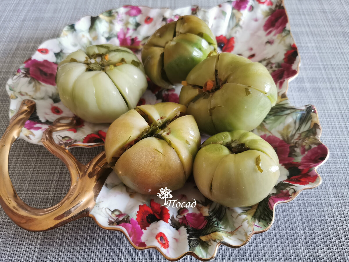 Муж торжественно именует это блюдо «первая закусь». Подцепляет на вилочку один зелёный помидорчик, щедро сдобренный ароматной начинкой, за ним - второй, третий, и так, пока я не отниму и не спрячу банку.