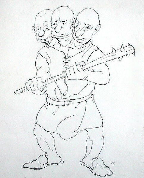 продолжение отсюда (мой перевод, сборник 1890 года. и заметьте как совершенно по разному иллюстраторы видят тот же самый персонаж) Джек же во весь опор поскакал дальше. Подъехал к воротам замка и застучал так громко, что грохот отдался от всех окрестных холмов. А великан заревел как раскат грома: — Кто там? Джек ответил: — Никто иной как твой племянник, разве не узнаешь меня? Великан спросил: — Какие вести принес, племянник? — Тяжелые, любимый дядя! — ответил Джек. — Вот как! — сказал великан. — Разве можно приносить мне нехорошие новости? Ведь я — трехголовый великан. И я, как ты знаешь, выхожу сражаться против пятисот воинов в доспехах, и они летят прочь от меня как гонимая ветром солома. — Да, но сюда приближается королевский сын с целой тысячей воинов в латах! — ответил Джек. — Они хотят убить тебя и уничтожить всё , что у тебя есть! — Вот как, племянник! — воскликнул великан. — Ну это воистину скверные вести! Я побегу и спрячусь, а ты же, прошу, запри меня на замок, на засов