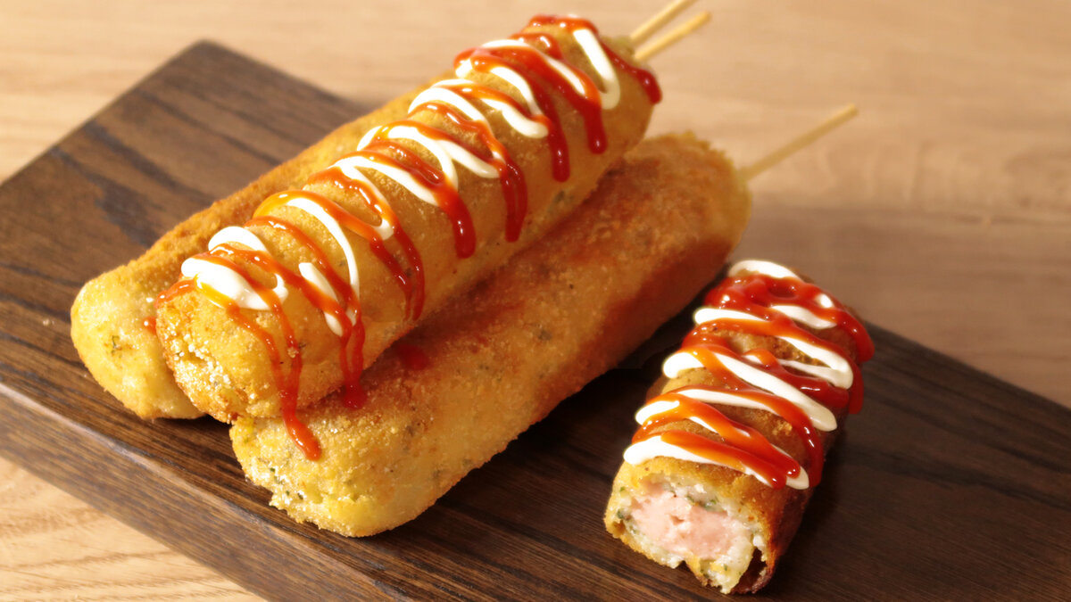 Разогреваю масло в сковороде масло до кипения, опускаю туда заготовки. Если шпажка не входит в сковородку, можно ее немного обломать. Обжариваю сосиски кипящем масле примерно две-три минуты, до румяной корочки.