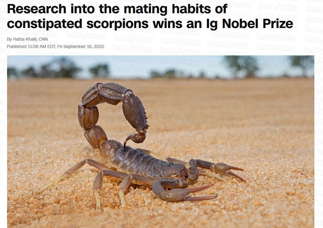 Чтобы спастись от хищников, некоторые скорпионы сбрасывают свою задницу, из-за чего больше не могут испражняться и умирают от запора через несколько месяцев. Зато это не мешает им спариваться Кажется бредом? А вот биологи из Бразилии за это открытие получили Шнобелевскую премию, церемония которой прошла этой ночью. Премию в области литературы вручили за «анализ того, почему юридические документы слишком сложно читать» (всё дело в шрифте и заумных словах). Учёные, которые нашли самый удобный способ поворачивать дверную ручку, удостоились премии по инженерии. Премию по физике дали тем, кто попытался понять, как утятам удаётся плыть строем за своей мамой. Почему успешными чаще становятся не талантливые люди, а те, кому просто везёт? За математическое объяснения этого феномена была вручена премия по экономике. Ну а премию мира дали за разработку алгоритма, помогающего сплетникам решать, когда говорить правду, а когда лгать. Но задница скорпиона, конечно, всех обставила