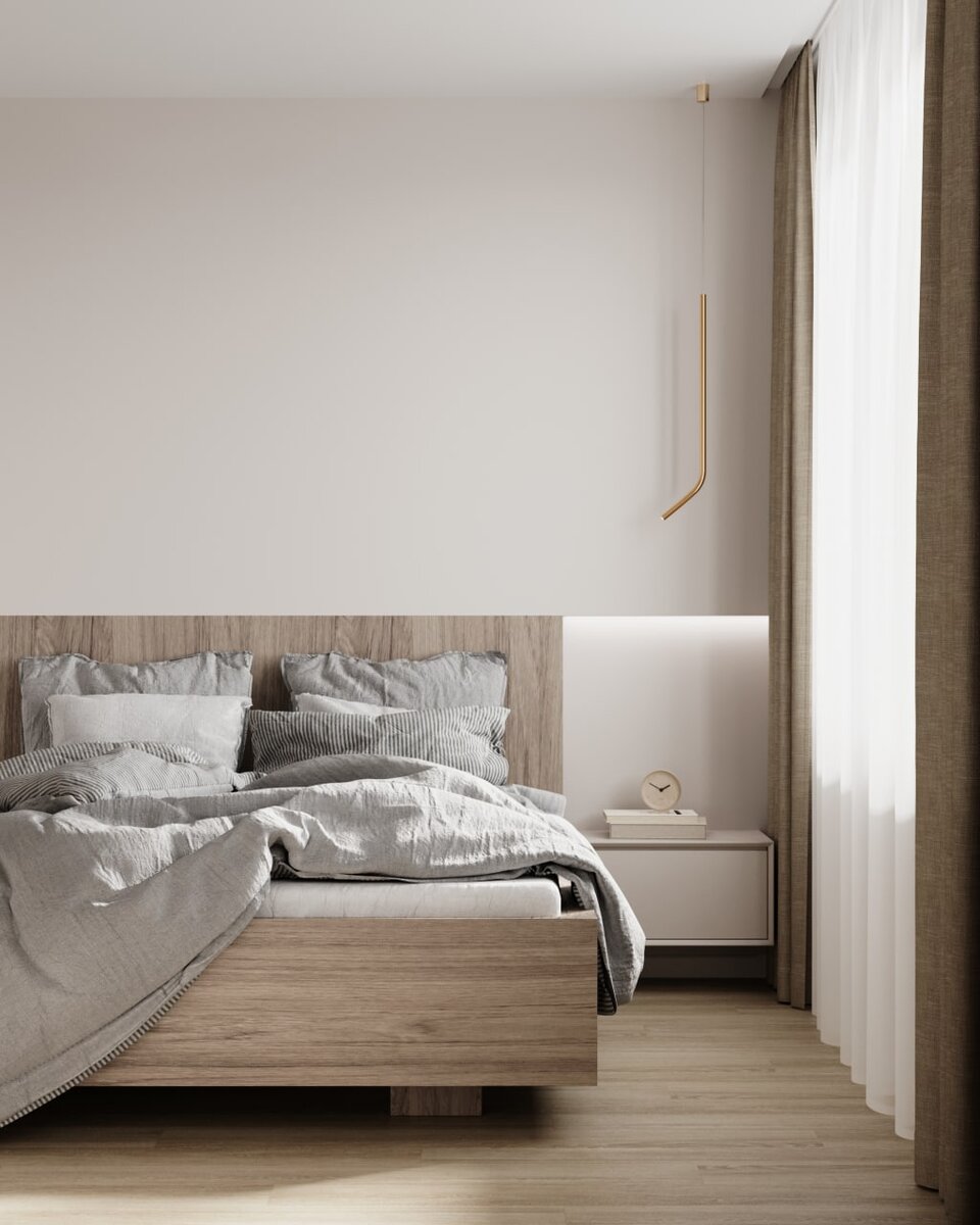 Прекрасный проект у нас получился под названием «Белый луг». Очень светлый, лаконичный и современный. В монохромном интерьере очень важны материалы и оттенки. Поэтому для пола была выбрана отличная инженерная доска. Никакой ламинат не сможет стать деревом. Таким образом мы подбираем все материалы для отделки. Очень важно увидеть их вживую, потрогать и собрать вместе. Это любимый этап работы как для дизайнера, так и для заказчика. Процесс подбора цвета самый непростой. Нам нужен был белый цвет, но с легким оттенком серо-коричневого. Выбрав сначала по образцам, потом необходимо сделать выкрасы непосредственно на стенах в помещении. Таким образом мы выбрали идеальный цвет всего лишь со второго образца. Увидев эту кровать, сразу стало понятно, что это то, что нужно. Прекрасное семейное Производство мебели из натурального дерева. Отзывчивые и внимательные поставщики - залог успеха. Был выбран нужный оттенок дерева и определенная высота спинки, чтобы кровать встала в подготовленную нишу с