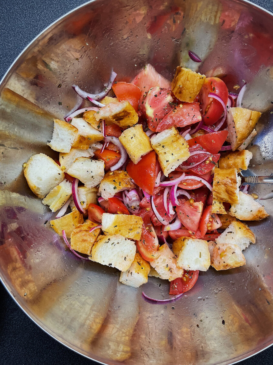 Ингредиенты: Процесс: Томаты крупно режем. Лук - полукольцами и выдерживаем в винном уксусе. В чашу выкладываем поочередно томаты и маринованный лук, вливаем оливковое масло, всыпаем базилик, чёрный молотый перец, соль, подсушенную чиабатту кусочками. Аккуратно перемешиваем. Да-да, просто идеален к равиоли 🥟