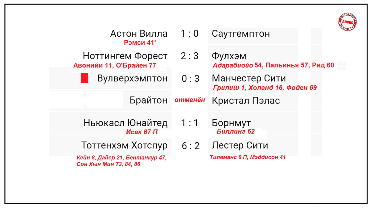 В чемпионате Англии завершился 8-й тур. Рассказываю о результатах, расписании, таблице. Посмотрим, кто лидирует во Франции, Германии, Италии, Испании. Фишкой выпуска станет общая таблица 5-ти лиг. Астон Вилла в субботу переиграла Саутгемптон 1:0 и поднялась на 13-е место. Ноттингем уступил Фулхэму 2:3. Хозяева поля проиграли свой 4-й матч кряду. Вулверхэмптон - Манчестер Сити 0:3. У победителей матча увеличилась беспроигрышная серия до 10 игр. Игра между Брайтоном и Кристал Пэласом отменёна из-за забастовки. Ньюкасл и Борнмут решили не расстраивать поклонников (1:1). «Сороки» имеют 4 игры без побед. Тоттенхэм победил Лестер 6:2. В чемпионате страны «шпоры» не уступают 12 последних туров. Матчи Челси и Ливерпуля, Манчестер Юнайтед и Лидса перенесены. В Англии - день скорби. В воскресенье (18 сентября) Брентфорд проигрывает Арсеналу 0:3. Жезус забивает 4-й гол в официальной встрече за «канониров». Его команда имеет 1 поражение и 13 побед. Эвертон с минимальным счетом обыграл Вест Хэм 1: