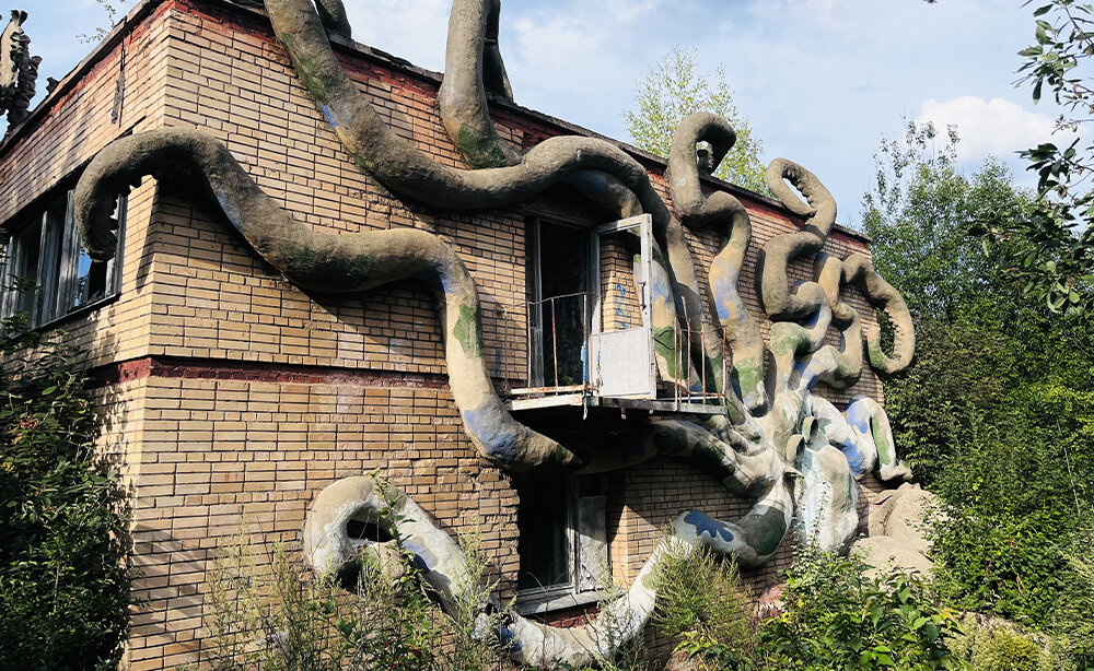 Здесь все по хардкору, огромный осьминог, который буквально обвил щупальцами корпус, где спали дети, гигантская камбала, смотрящая на тебя своими глазами. Маленький ребенок либо тонущий, либо радующийся солнцу…Жуткие ракушки, рыбы, львы, ящеры. Все скульптуры выполнены из бетона и раскрашены масленой краской. Картинка прямо скажу не самая добрая. Но, Добро пожаловать в «Сказку»!