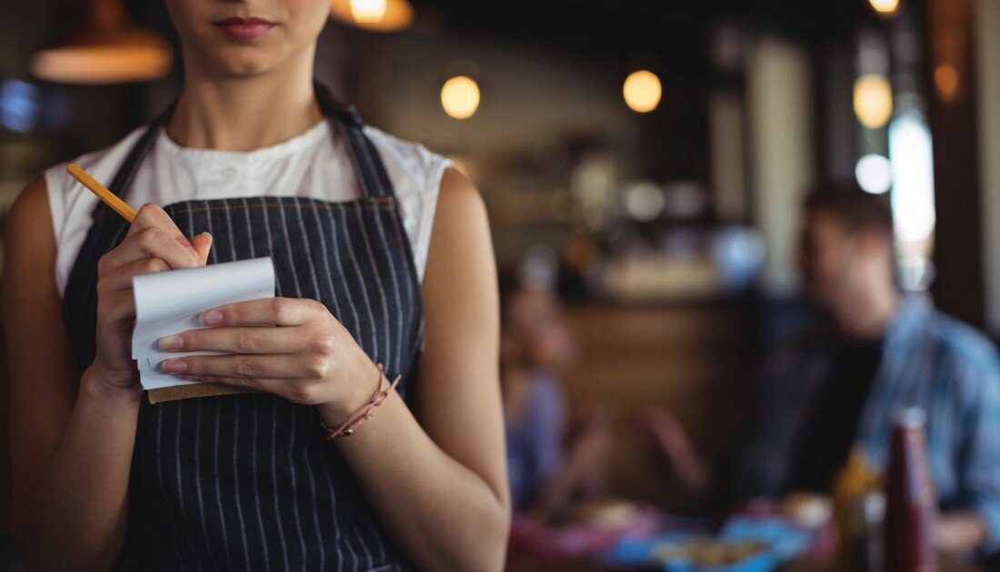 Официантка закинула в рот жевательную резинку и выдула огромный пузырь.