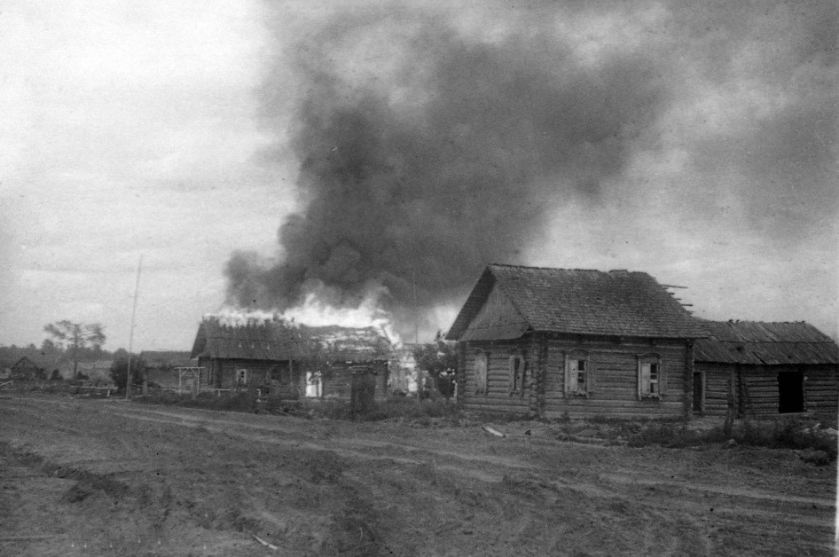 Крест-накрест синие полоски На окнах съёжившихся хат. Родные тонкие берёзки Тревожно смотрят на закат. И юноша в одежде рваной Повешен на сухой сосне, И чей-то грубый иностранный, Не русский голос в тишине... И пёс на тёплом пепелище, До глаз испачканный в золе Он целый день кого то ищет И не находит на селе. Накинув драный зипунишко, По огородам, без дорог Бежит, торопится парнишка По солнцу прямо на восток. В нетопленой разбитой бане Ночь скоротавши, как зверёк Как долго он своим дыханьем Озябших рук согреть не мог! С рассветом обходя селенья И полицейские посты, Ища от Гитлера спасенья, Ложась и прячась за кусты, Всё видевший, на всё готовый, По грудь проваливаясь в снег, Бежал к своим русоголовый Десятилетний человек. Никто в далёкую дорогу Его теплее не одел, Никто не обнял у порога И вслед ему не поглядел. Мать? Но она была убита. Сестра? Она была мертва; Она лежит с лицом открытым На дне чудовищного рва. Соседи? Их осталось мало; Их с каждой ночью, с каждым днём Всё убывало, убы