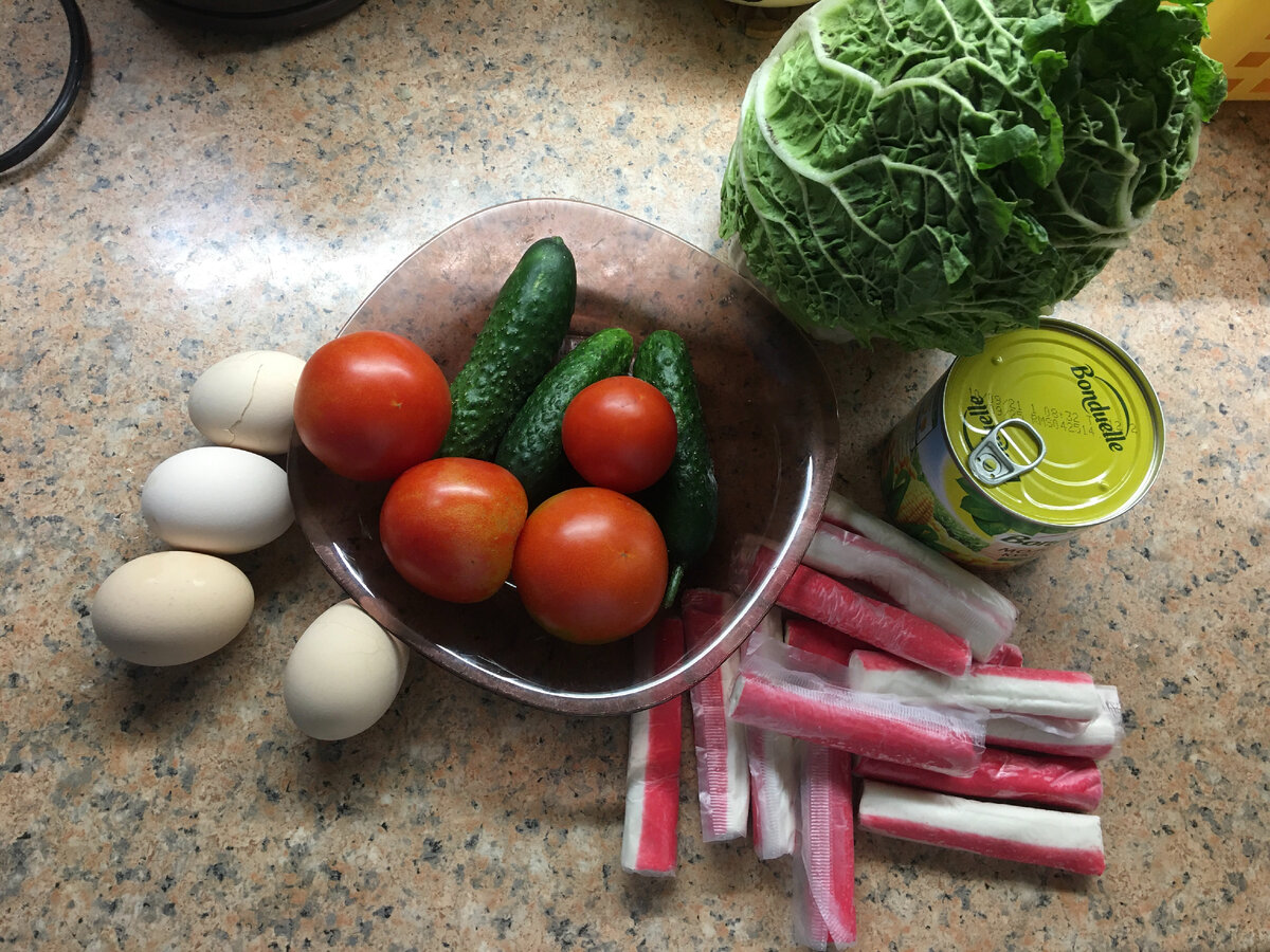 Нам понадобится (при расчёте на 6 человек) -крабовые палочки 15 шт -банка кукурузы (лучше сладкой) -огурцы 3 шт -помидоры 3-4шт -пекинская капуста 1шт -майонез для заправки -соль, перец по желанию Яйца отварить вкрутую, остудить и почистить Крабовые палочки, яйца, огурцы и помидоры нарезаем средним кубиком Пекинскую капусту разделить, вырезать твёрдую часть Порезать на средние кусочки Всё перекладываем в глубокую миску Добавляем майонез, соль (пару щепоток) и перец. Тщательно перемешиваем Приятного аппетита! #еда #кулинария #рецепты #салат