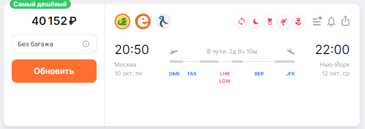Возможно ли долететь в США за 16000 рублей в 2022 году? Отвечая на этот вопрос, я вспоминаю "доковидное" время, когда летали прямые рейсы с Москвы до Нью-Йорка за 25-30 тысяч рублей туда-обратно и мне становится грустно. Но если постоянно грустить и искать разного рода причины для отмены поездки в ту или иную страну, то никогда никуда выехать и не получится! Да, раньше было проще и с какой-то точки зрения дешевле путешествовать и познавать этот прекрасный мир, но не стоит отчаиваться и опускать руки. Выход есть всегда! Сегодня я хочу рассказать вам более подходящий вариант перелета до США(Нью-Йорк) с России. Если искать билет, как это делают все, т.е открывать поисковик авиабилетов или сайт авиакомпании, выбирать Москва-Нью-Йорк, то мы видим рейс с кучей пересадок и ценой в 40000 рублей. Либо одной пересадкой в Стамбуле, но ценой в 60000 рублей. Появляется вопрос-как купить билет за 16000? В прошлой моей статье я рассказывал как попасть в европу за 3506 рублей и теперь я хочу подели