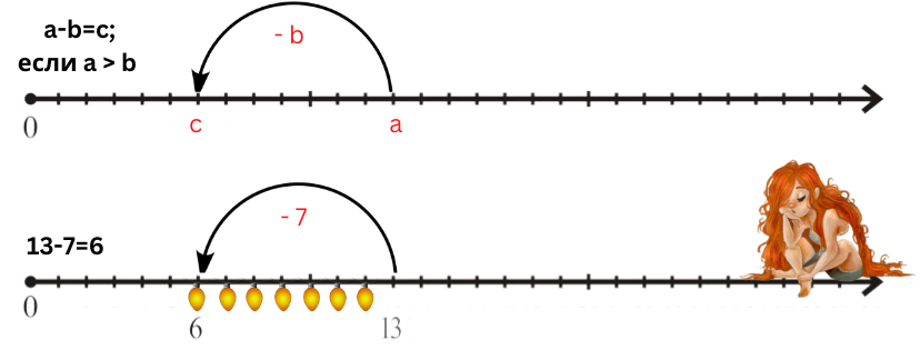 Рада тебя видеть Дружок. Продолжаем шлифовать навыки вычитания неотрицательных чисел. Для расширения кругозора покажу тебе, как на координатном луче найти разность неотрицательных чисел 13 и 7; разность натуральных чисел a и b, при условии, что a > b. Стрелочка луча показывает направление отсчёта. Данный материал даю на опережение. Если сложно для понимания, пропусти. Чтобы на координатном луче найти разность 13-7, отметь на нём число 13 и отсчитай влево 7 делений. Найденная координата точки соответствует числу 6. 13-7=6 Неотрицательные натуральные числа a и b выбраны произвольно при условии, что a > b. Число с также может принимать различные натуральные значения. a-b=c Как только координатный луч с положительными числами дополнится противоположным лучом с такой же разметкой (делениями) для отрицательных чисел, он станет называться координатной прямой. Не переживай, если математические термины пока не укладываются в голове. С координатной прямой ты познакомишься в 7 классе на уро