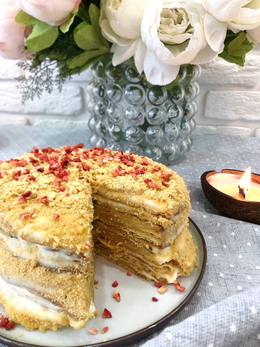 Нежный, не жирный торт и в меру сладкий. Если кому надо жирнее и слаще- просто смените сметану на домашнюю и больше сахара. Но мы такое не любим. ДЛЯ КОРЖЕЙ: 🍮 Мёд 200 гр 🍮Сахар 100 гр 🍮Яйца 4 шт 🍮Сливоч.масло 100 гр 🍮Мука (потребуется около 800-850г муки в зависимости от её качества) 800 гр 🍮Вода 50 мл 🍮Сода пищевая 2 ч.л. ДЛЯ КРЕМА: 🍮Сметана 15% (можно жирностью 30% и выше, но мне вариант с магазинной сметаной нравится больше, он нежнее получается) 1000 гр 🍮Сахар (или по вкусу) 100 гр 🍮Ванильный сахар (по желанию) 10 гр Приготовление коржей: Поставьте сотейник с мёдом на небольшой огонь. Когда мёд полностью растопится, прогрейте его, но не доводите до кипения! Снимите сотейник с огня. В горячий мёд добавьте соду. Всё тщательно размешайте. Должна получиться пышная и густая пена. Всыпьте сахар и добавьте воду. Перемешайте. Масса успокоится, пена осядет. Верните сотейник на плиту на небольшой огонь. Прогрейте смесь, постоянно помешивая, до тех пор, пока сахар максимально не