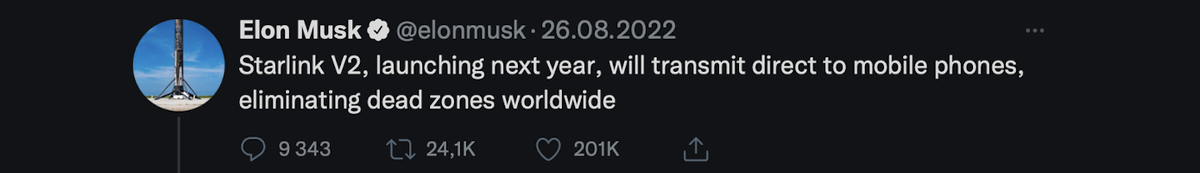 Для начала посмотрите вот на этот твит Илона Маска: "Starlink V2 будет запущен в следующем году, будет обмениваться данными напрямую со смартфоном и уничтожит “мертвые зоны” по всему миру."