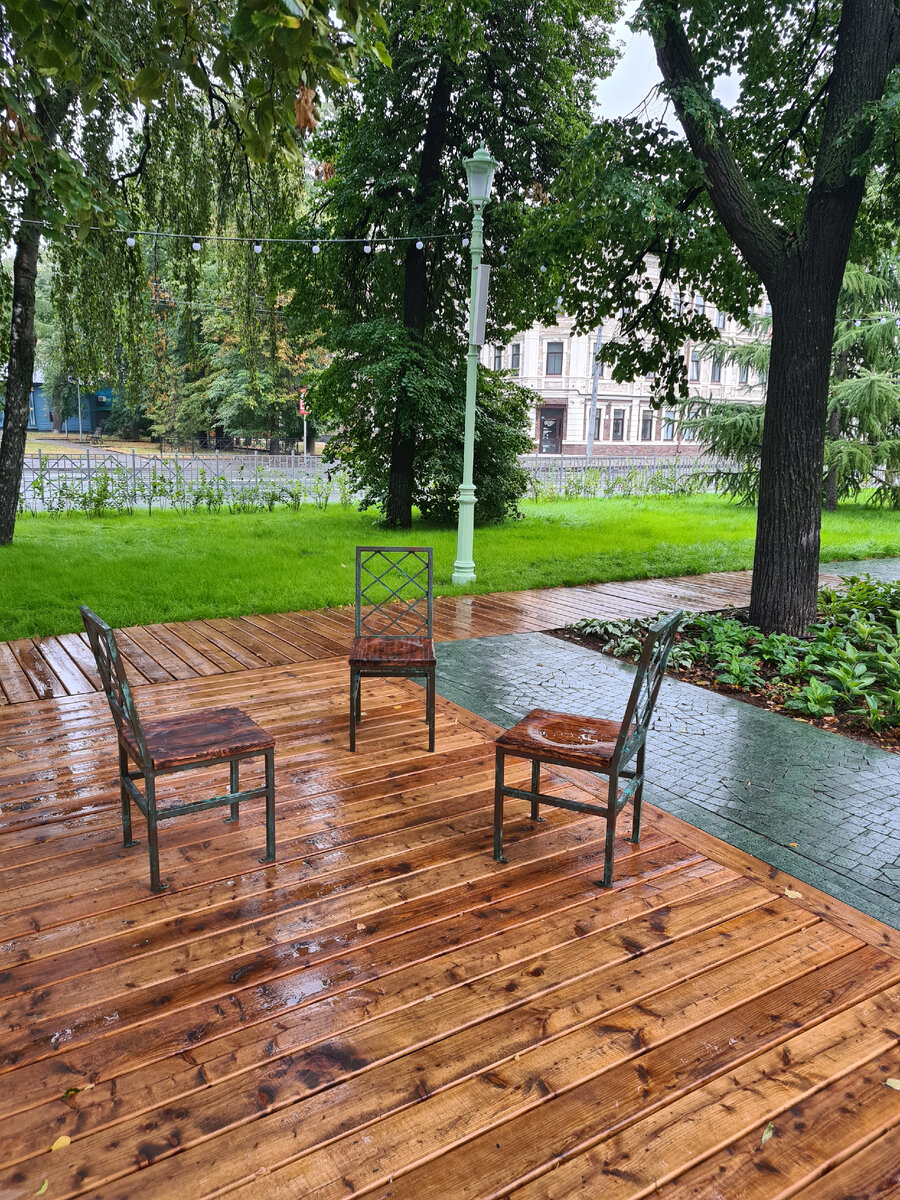 Вместо привычных скамеек - стулья. Оригинально. Небольшая колонка, из которой можно выпить воды. Приятное сочетание изумрудного и коричневого. Место не только для печали, но и для размышлений.