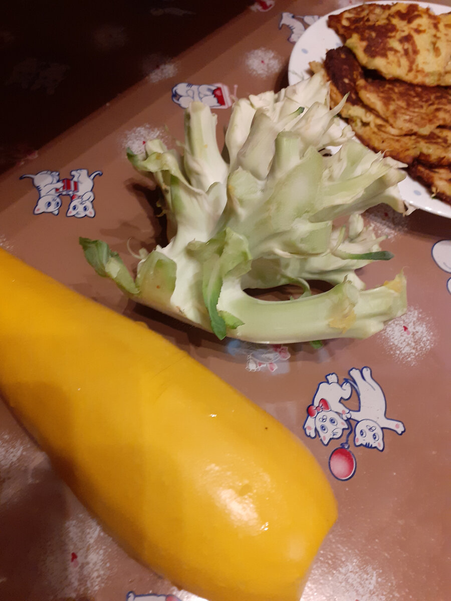 После того, как срезаны соцветия брокколи или цветной капусты, остаётся вот такая внушительная кочерыжка-дерево. Жалко же выбрасывать. Я её тру на мелкой (иногда и на крупной) тёрке и добавляю к кабачковым оладушкам. Примерно треть от кабачка.