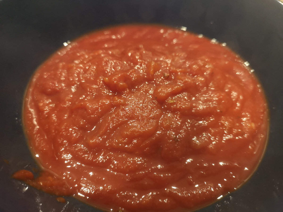 - Шаг 2 Разогрейте оливковое масло в глубокой сковороде на средне-высоком огне. Обжарьте лук, чеснок, итальянскую приправу и (красный перец) в разогретом масле, пока лук не начнет размягчаться, около 5 минут. Добавьте томатный соус и перемешайте. Так же можно добавить 10мл красного вина.