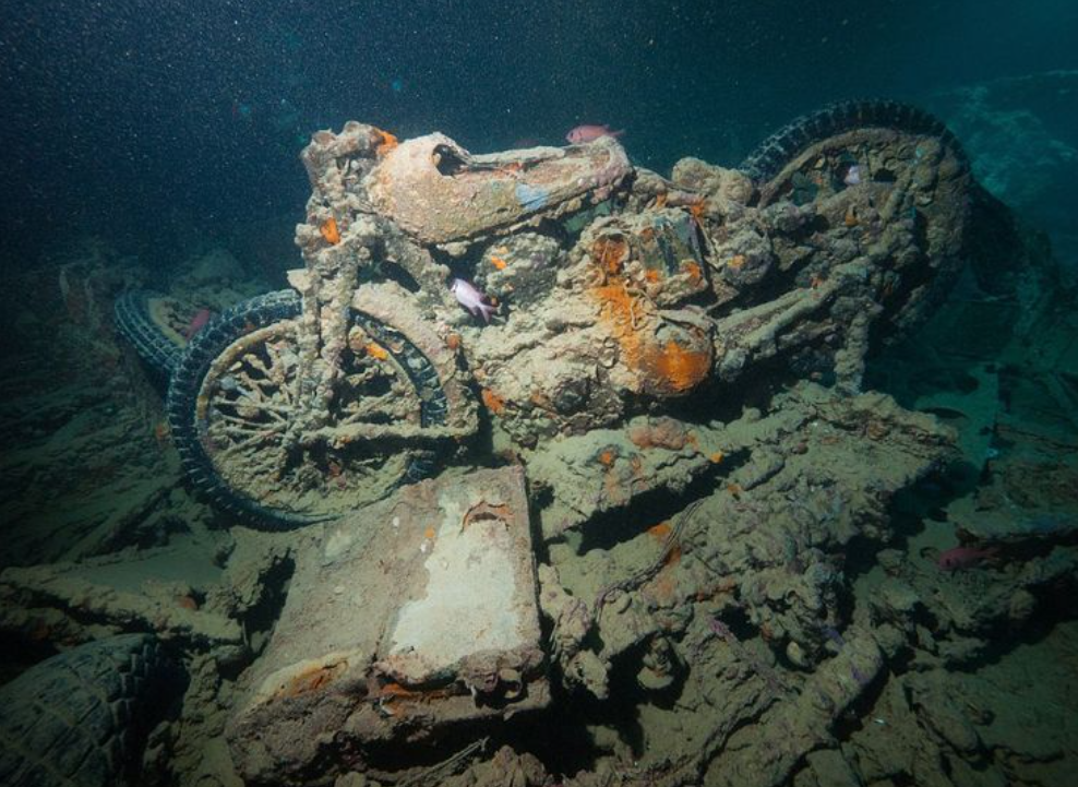 Военные мотоциклы и транспортные средства, обнаруженные после кораблекрушения в Красном море в 1941 году.