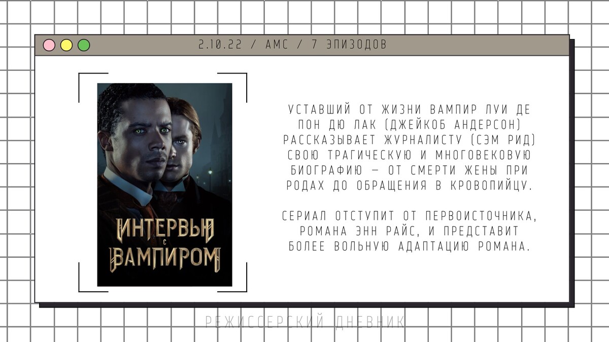 Самый мистический месяц в году оказался не так богат на сериальные премьеры (как хотелось бы). Но все они как нельзя лучше подходят для атмосферы осени и Хэллоуина (кто-нибудь отмечает?)). Сериалов немного, всего четыре, но тем не менее, поговорим в конце о тех проектах, которые еще выходят, и немного о фильмах. Там тоже есть очень занимательные новиночки! ° Интервью с вампиром В далеком 1994 году вышел одноименный фильм по роману Энн Райс с Томом Крузом, Брэдом Питтом и Кирстен Данс. Пришло время перезапуска в виде сериала по всей видимости! Всего нас ждет 7 серий новой вампирской интерпретации. Забавно, что в сентябре тоже вышел сериал, который также базируется на книге про вампиров, и до него выходил фильм))) ° Вампир Реджинальд Показалось забавным, что сериал тоже про вампиров (2022 решил вспомнить былые деньки популярности живых мертвецов? х)). Ну и главный актер проекта играл Нэда из Человека Паука Тома Холланда, поэтому взгляд и зацепился. А уже описание заинтересовало т