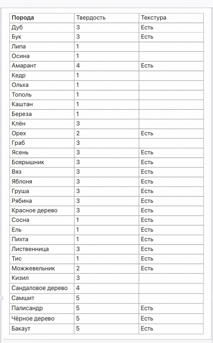 Наша природа создала огромное количество разновидностей пород деревьев, которые отличаются друг от друга твердостью, цветом, текстурой, структурой, выносливостью и многими другими особенностями. Перед тем как создавать свое изделие, нужно изучить эти особенности древесины. Твердость древесины - уровень сопротивления воздействию твердых тел на ее структуру. Этот параметр полностью зависит от показателя плотности древесины. Текстура древесины - это узор на срезе дерева, который образовался в результате многолетнего наслоения его волокон. В данной таблице представлена твёрдость и наличие ярко выраженной текстуры древесины. 1- очень мягкая 2- мягкая 3-средней твердости 4- твёрдая 5- очень твёрдая